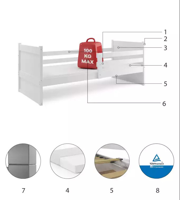 Dětská postel RICO 90x200 cm, s matrací, Bílá/Bílá