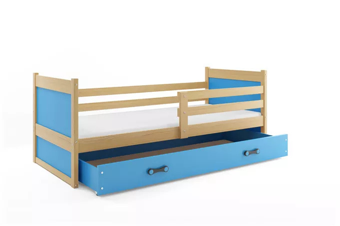 Dětská postel RICO 90x200 cm se šuplíkem, s matrací, Přírodní/Modrá