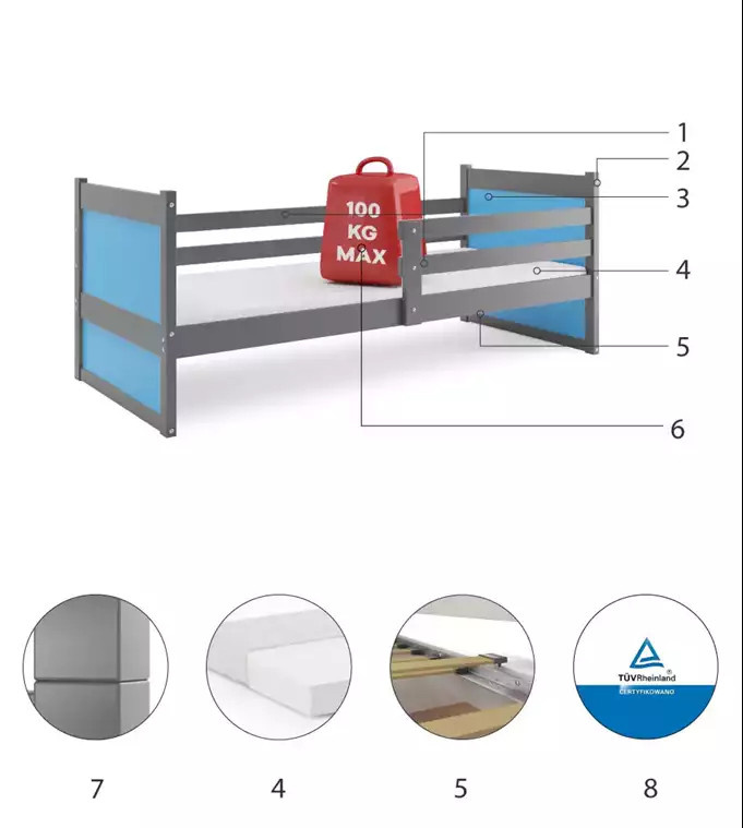 Dětská postel RICO 90x190 cm, s matrací, Grafit/Modrá