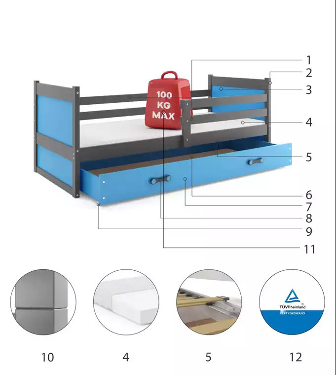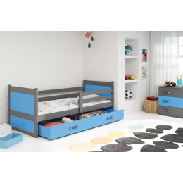 Dětská postel RICO 90x200 cm se šuplíkem, s matrací, Grafit/Modrá