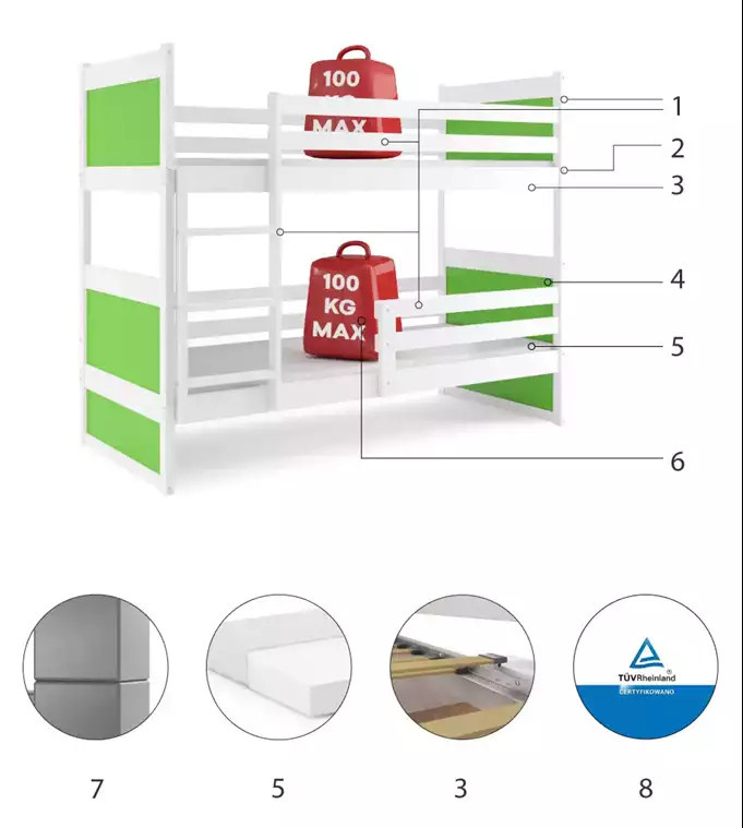 Dětská patrová postel RICO 90x200 cm, bez matrace, Bílá/Zelená