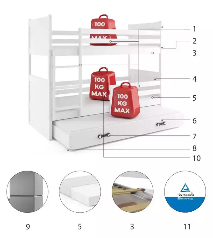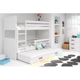 Dětská patrová postel RICO 3 s přistýlkou 90x200 cm, bez matrace, Bílá/Bílá