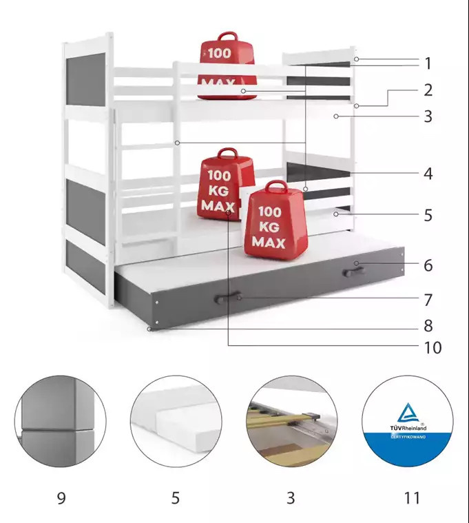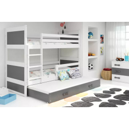 Dětská patrová postel RICO 3 s přistýlkou 90x200 cm, včetně matrací, Bílá/Grafit