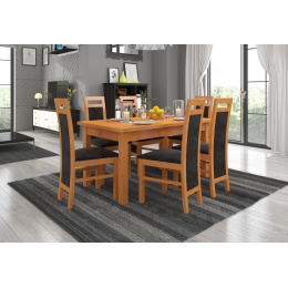 Sestava RODOS 14 je ideálním řešením pro klasickou jídelnu. Součástí sady je pevný stůl a šest pohodlných židlí. Stůl s jednoduchým designem umožní pohodlně usadit 6 osob. Nábytek je velmi elegantní a pohodlný. Vyber barvu a kolekci látky a navrhni si svou vysněnou sadu.