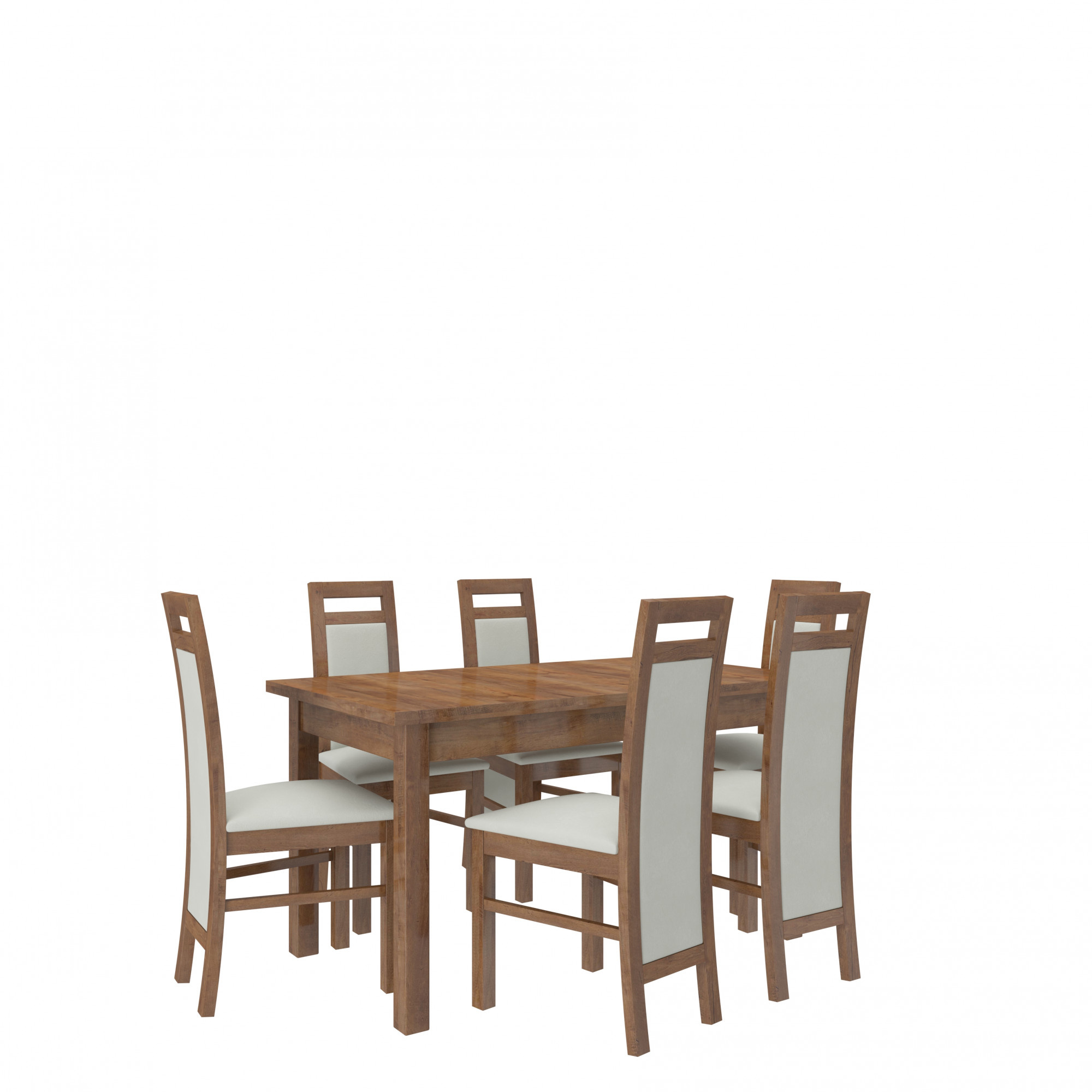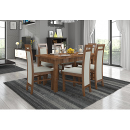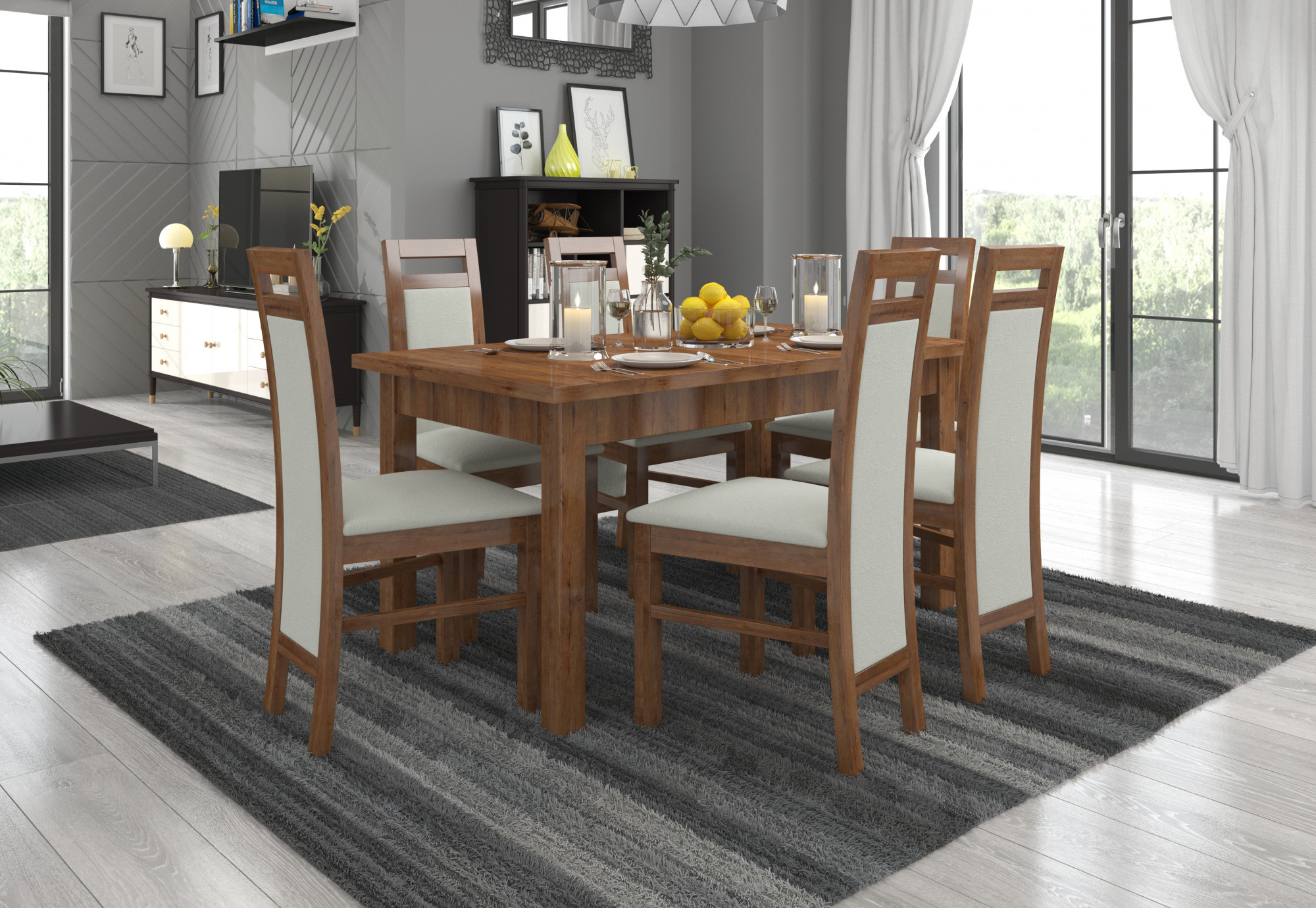 Sestava RODOS 14 je ideálním řešením pro klasickou jídelnu. Součástí sady je pevný stůl a šest pohodlných židlí. Stůl s jednoduchým designem umožní pohodlně usadit 6 osob. Nábytek je velmi elegantní a pohodlný. Vyber barvu a kolekci látky a navrhni si svou vysněnou sadu.
