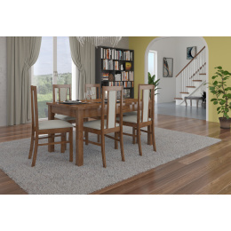 Sestava RODOS 52 je ideálním řešením pro klasickou jídelnu. Součástí sady je pevný stůl a šest pohodlných židlí. Stůl s jednoduchým designem umožní pohodlně usadit 6 osob. Nábytek je velmi elegantní a pohodlný. Vyber barvu a kolekci látky a navrhni si svou vysněnou sadu.