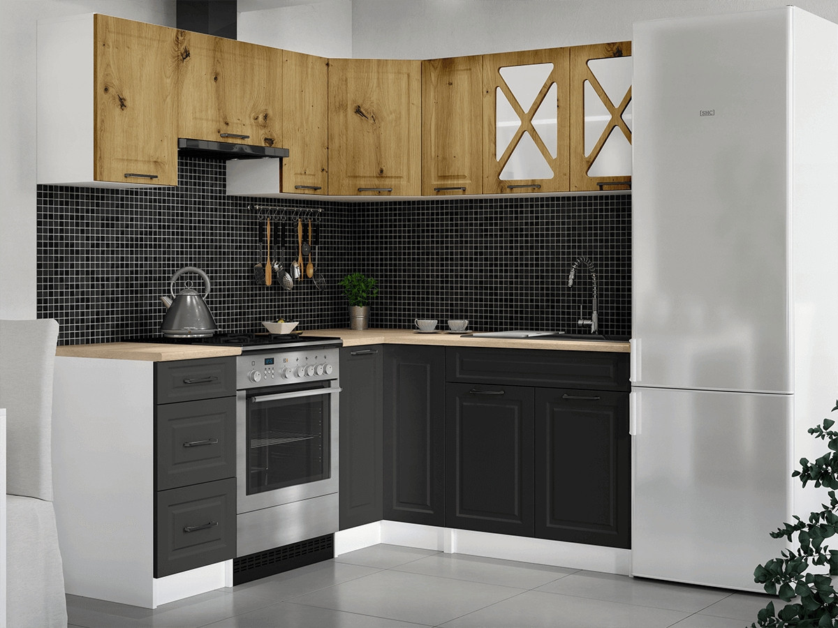 Kuchyňská linka Astra je vyrobená ve venkovském stylu, který se hodí do kuchyně v paneláku i v rodinném domě. Tento styl má jedinečnou schopnost proměnit Vaši kuchyň v útulnou a zároveň funkční místnost, kde bude radost vařit i péct. Rohová kuchyňská linka Astra nabízí dostatek úložného i pracovního prostoru. Kuchyňské skříňky jsou samostatné, takže si je můžete sestavit podle potřeby tak, jak Vám to vyhovuje. Korpusy skříněk jsou vyrobené z lamina 18 mm s hranami ABS a dvířka jsou MDF 16mm. Všechny skříňky jsou dodávány v demontu. Součástí balení je montážní plánek včetně všech potřebných spojovacích prvků. Cena je uvedena za sestavu vyobrazenou na úvodní fotografii BEZ PRACOVNÍ DESKY, s úchytkami, které jsou vyobrazeny v doplňkových fotografiích. Pracovní desku lze dokoupit nad každou skříňku zvlášť podle její šíře. Vyobrazené spotřebiče, dřez, baterie, doplňky a dekorace nejsou v ceně. Kuchyň bude dodaná s bílými korpusy a dvířky v dekóru artisan a grafit. Zobrazení barev na fotografii se může od skutečnosti lišit.