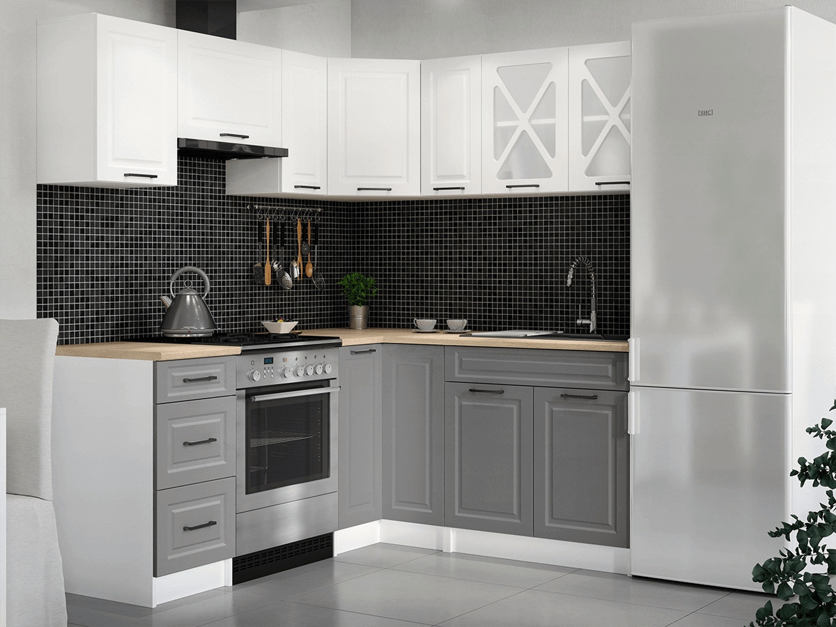 Kuchyňská linka Astra je vyrobená ve venkovském stylu, který se hodí do kuchyně v paneláku i v rodinném domě. Tento styl má jedinečnou schopnost proměnit Vaši kuchyň v útulnou a zároveň funkční místnost, kde bude radost vařit i péct. Rohová kuchyňská linka Astra nabízí dostatek úložného i pracovního prostoru. Kuchyňské skříňky jsou samostatné, takže si je můžete sestavit podle potřeby tak, jak Vám to vyhovuje. Korpusy skříněk jsou vyrobené z lamina 18 mm s hranami ABS a dvířka jsou MDF 16mm. Všechny skříňky jsou dodávány v demontu. Součástí balení je montážní plánek včetně všech potřebných spojovacích prvků. Cena je uvedena za sestavu vyobrazenou na úvodní fotografii BEZ PRACOVNÍ DESKY, s úchytkami, které jsou vyobrazeny v doplňkových fotografiích. Pracovní desku lze dokoupit nad každou skříňku zvlášť podle její šíře. Vyobrazené spotřebiče, dřez, baterie, doplňky a dekorace nejsou v ceně. Kuchyň bude dodaná s bílými korpusy a dvířky v dekóru bílá a šedá. Zobrazení barev na fotografii se může od skutečnosti lišit.