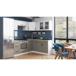 Kuchyňská linka Romana je vyrobená ve venkovském stylu, který se hodí do kuchyně v paneláku i v rodinném domě. Tento styl má jedinečnou schopnost proměnit Vaši kuchyň v útulnou a zároveň funkční místnost, kde bude radost vařit i péct. Rohová kuchyňská linka Romana nabízí dostatek úložného i pracovního prostoru. Kuchyňské skříňky jsou samostatné, takže si je můžete sestavit podle potřeby tak, jak Vám to vyhovuje. Korpusy skříněk jsou vyrobené z lamina 18 mm s hranami ABS a dvířka jsou MDF 16mm. Všechny skříňky jsou dodávány v demontu. Součástí balení je montážní plánek včetně všech potřebných spojovacích prvků. Cena je uvedena za sestavu vyobrazenou na úvodní fotografii BEZ PRACOVNÍ DESKY, s úchytkami, které jsou vyobrazeny v doplňkových fotografiích. Pracovní desku lze dokoupit nad každou skříňku zvlášť podle její šíře. Vyobrazené spotřebiče, dřez, baterie, doplňky a dekorace nejsou v ceně. Kuchyň bude dodaná s bílými korpusy a dvířky v dekóru bílá a šedá. Zobrazení barev na fotografii se může od skutečnosti lišit.