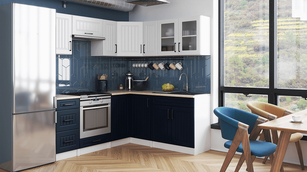 Kuchyňská linka Romana je vyrobená ve venkovském stylu, který se hodí do kuchyně v paneláku i v rodinném domě. Tento styl má jedinečnou schopnost proměnit Vaši kuchyň v útulnou a zároveň funkční místnost, kde bude radost vařit i péct. Rohová kuchyňská linka Romana nabízí dostatek úložného i pracovního prostoru. Kuchyňské skříňky jsou samostatné, takže si je můžete sestavit podle potřeby tak, jak Vám to vyhovuje. Korpusy skříněk jsou vyrobené z lamina 18 mm s hranami ABS a dvířka jsou MDF 16mm. Všechny skříňky jsou dodávány v demontu. Součástí balení je montážní plánek včetně všech potřebných spojovacích prvků. Cena je uvedena za sestavu vyobrazenou na úvodní fotografii BEZ PRACOVNÍ DESKY, s úchytkami, které jsou vyobrazeny v doplňkových fotografiích. Pracovní desku lze dokoupit nad každou skříňku zvlášť podle její šíře. Vyobrazené spotřebiče, dřez, baterie, doplňky a dekorace nejsou v ceně. Kuchyň bude dodaná s bílými korpusy a dvířky v dekóru bílá a tmavě modrá. Zobrazení barev na fotografii se může od skutečnosti lišit.