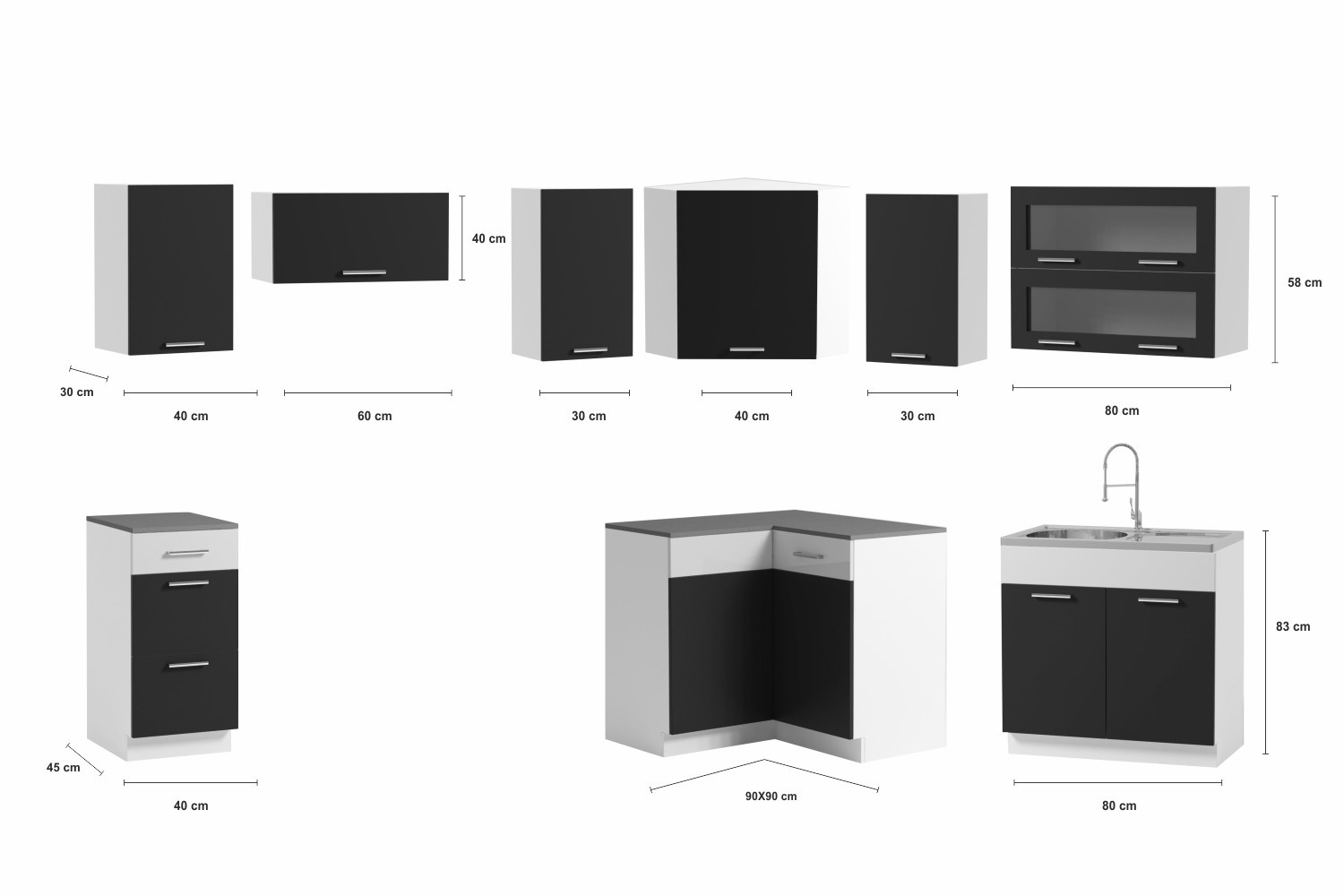rohová skříňka 80x80 cm, v.83 cm Skutečný rozměr skříňky bez pracovní desky je 80x80 cm/ výška 83 cm, s pracovní deskou je rozměr 90x90 cm. V případě zájmu o dokoupení desky nad tuto skříňku, je potřeba objednat dělenou desku 90 a 30 cm