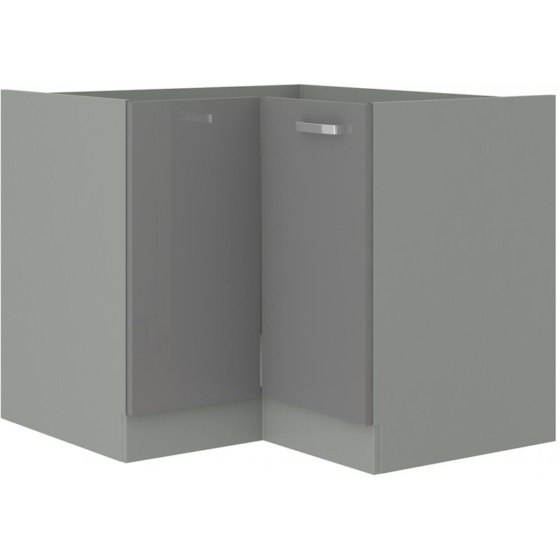 Spodní rohová kuchyňská skříňka je vyrobena z lamina tloušťky 16 mm šedé lesklé barvy. Korpus skříňky je v šedém provedení. Skříňka je vyrobena z kvalitních MDF desek a uvnitř najdete jednu polici. Skříňka má kovový úchyt, který můžete namontovat vertikálně nebo horizontálně (délka 135mm). Dvířka jsou vybavena systémem tichého zavírání a lze je sestavit jako pravé či jako levé. Poskládejte si z naší bohaté nabídky skříněk moderní a designovou kuchyň podle Vašich představ. Skříňka je dodávaná v demontu. Součástí je montážní plánek včetně všech potřebných spojovacích materiálů.