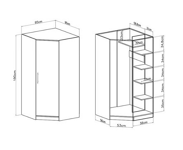 Rozměry: S šířkou 95 cm, výškou 190 cm a hloubkou 95 cm nabízí skříň dostatek prostoru pro uložení veškerého vašeho oblečení a doplňků. Je ideální pro menší i větší místnosti, kde je potřeba efektivně využít každý centimetr.