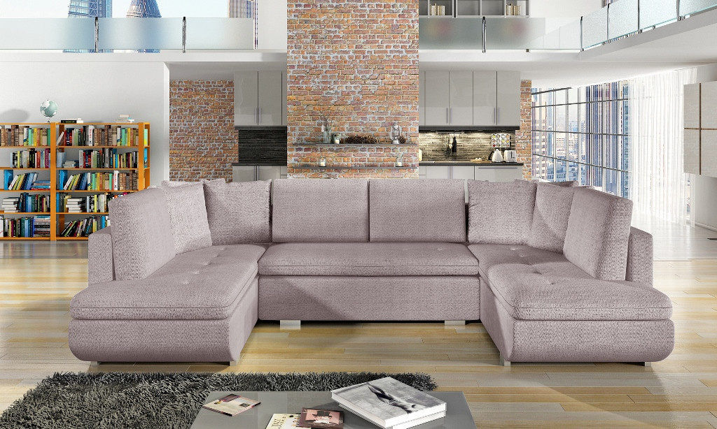 Rohová sedací souprava ARGENT U je univerzální rohová sedací souprava, kterou lze díky čalouněnému opěradlu umístit jak ke stěně obývacího pokoje, tak do jeho střední části. Moderní rohová pohovka ve tvaru U je rozkládací kus nábytku, který lze rychle přeměnit z obývacího na spací. Rohová sedačka pro více osob je vybavena automatickou rozkládací pomůckou, takže ji zvládnou starší lidé i děti. Dřevěný rám je doplněn vlnitými pružinami na spací ploše, sedáku a opěráku a čalounickou pěnou T-30. Model ARGENT U stojí na stylových chromovaných nohách, které dotvářejí celé uspořádání. Moderní rohová pohovka je čalouněná kvalitní látkou, která je k dispozici v široké škále barev. Čalouněná rohová sedací souprava s polštáři je vybavena prostorným kontejnerem na lůžkoviny, do kterého se snadno vejdou polštáře, přikrývky a peřiny, tedy všechny prvky potřebné k přípravě lůžka na spaní. Moderní rohová pohovka ARGENT do U s bočnicemi zaujme dekorativním prošíváním umístěným na sedáku a kontrastní barevnou vložkou.