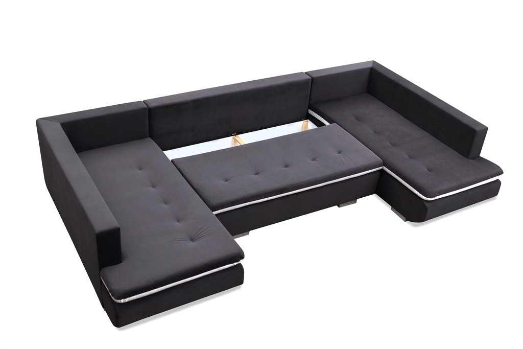 Rohová sedací souprava ARGENT U je univerzální rohová sedací souprava, kterou lze díky čalouněnému opěradlu umístit jak ke stěně obývacího pokoje, tak do jeho střední části. Moderní rohová pohovka ve tvaru U je rozkládací kus nábytku, který lze rychle přeměnit z obývacího na spací. Rohová sedačka pro více osob je vybavena automatickou rozkládací pomůckou, takže ji zvládnou starší lidé i děti. Dřevěný rám je doplněn vlnitými pružinami na spací ploše, sedáku a opěráku a čalounickou pěnou T-30. Model ARGENT U stojí na stylových chromovaných nohách, které dotvářejí celé uspořádání. Moderní rohová pohovka je čalouněná kvalitní látkou, která je k dispozici v široké škále barev. Čalouněná rohová sedací souprava s polštáři je vybavena prostorným kontejnerem na lůžkoviny, do kterého se snadno vejdou polštáře, přikrývky a peřiny, tedy všechny prvky potřebné k přípravě lůžka na spaní. Moderní rohová pohovka ARGENT do U s bočnicemi zaujme dekorativním prošíváním umístěným na sedáku a kontrastní barevnou vložkou.