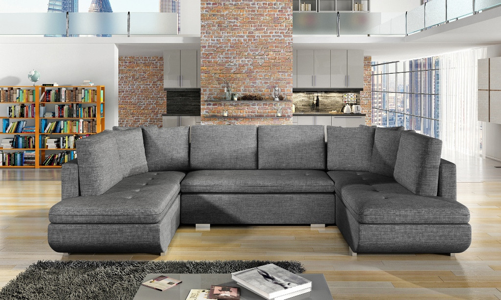 Rohová sedací souprava ARGENT U je univerzální rohová sedací souprava, kterou lze díky čalouněnému opěradlu umístit jak ke stěně obývacího pokoje, tak do jeho střední části. Moderní rohová pohovka ve tvaru U je rozkládací kus nábytku, který lze rychle přeměnit z obývacího na spací. Rohová sedačka pro více osob je vybavena automatickou rozkládací pomůckou, takže ji zvládnou starší lidé i děti. Dřevěný rám je doplněn vlnitými pružinami na spací ploše, sedáku a opěráku a čalounickou pěnou T-30. Model ARGENT U stojí na stylových chromovaných nohách, které dotvářejí celé uspořádání. Moderní rohová pohovka je čalouněná kvalitní látkou, která je k dispozici v široké škále barev. Čalouněná rohová sedací souprava s polštáři je vybavena prostorným kontejnerem na lůžkoviny, do kterého se snadno vejdou polštáře, přikrývky a peřiny, tedy všechny prvky potřebné k přípravě lůžka na spaní. Moderní rohová pohovka ARGENT do U s bočnicemi zaujme dekorativním prošíváním umístěným na sedáku a kontrastní barevnou vložkou.