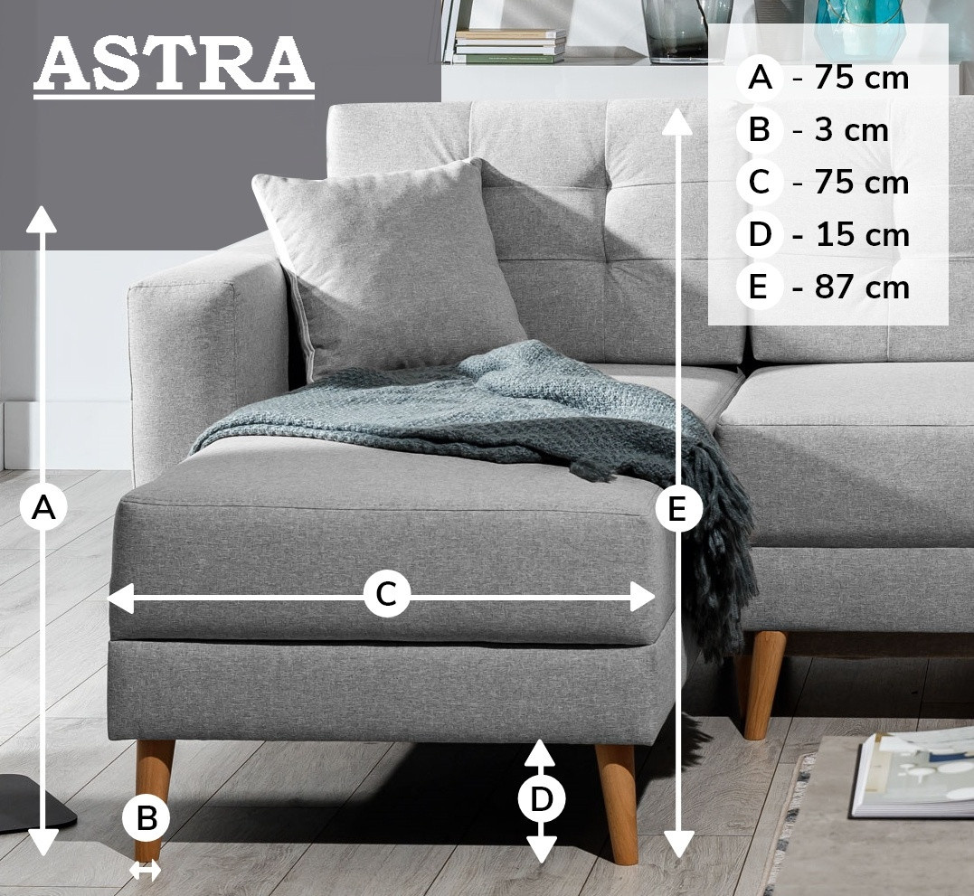 Rohová sedací souprava ASTRA je vyrobena z kvalitních materiálů. Konstrukce sedací soupravy je vyrobena z kombinace dřeva a dřevotřísky. Sedací část je vyrobena v kombinaci polyuretanové pěny T3030 a bonelů. Na opěru sedací soupravy je použita polyuretanová pěna T2140. Sedací souprava je rozkládací pomocí Automatu DL. Sedací souprava má prostorný úložný prostor pro úschovu lůžkovin. Sedací souprava je universální, můžete si stranu rohu měnit dle Vašeho uvážení.