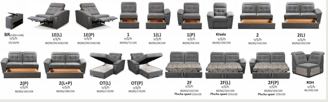 Rozměry sestavy 2F+R+2: 265 x 194, v. 86-96 cm (spací plocha: 195 x 126 cm)