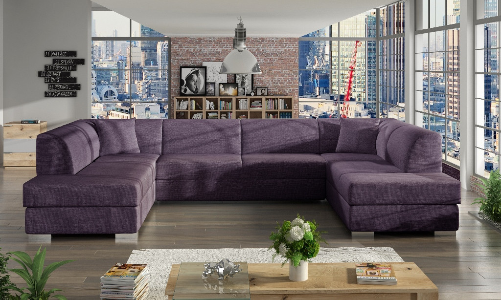 Stylová rohová pohovka DARCO do U je rozkládací pohovka, která se skvěle hodí do velkých obývacích pokojů - díky čalouněnému opěradlu ji lze umístit do jejich střední části. Dřevěný rám, který zajišťuje odolnost a stabilitu nábytku, je čalouněný látkou, jejíž povrchovou úpravu si můžete vybrat z barev dostupných ve vzorníku. Sedák je spolu s mírně profilovaným opěradlem vyplněn vlnitou pružinou a čalounickou pěnou T-30, která díky své zvýšené pružnosti zabrání vzniku nevzhledných promáčklin na nábytku. Všestranná rohová pohovka ve tvaru U je víceúčelový kus nábytku, který se vyznačuje moderním provedením zvýrazněným chromovanými nožkami a dekorativními polštáři, které jsou k dispozici jako součást soupravy. Volně stojící nábytek DARCO U je vybaven dvěma úložnými prostory a má také funkci spaní, díky níž lze nábytek bez bočnic rozložit. Model DARCO U se vyrábí také na individuální objednávku, takže je možné zvolit barvu rohových vložek.