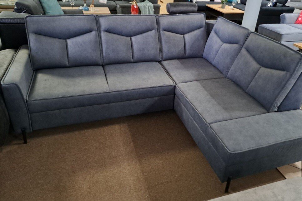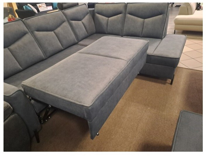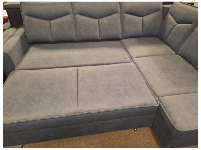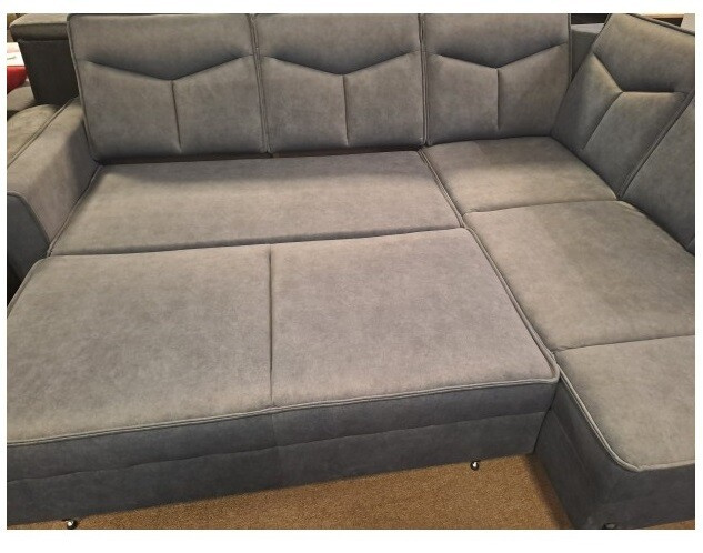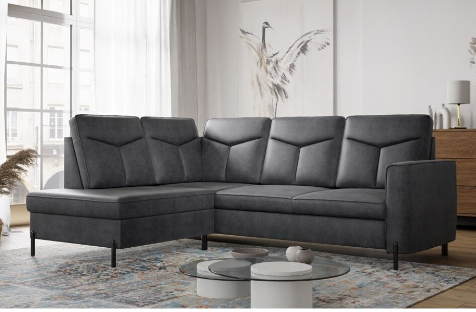 Rohová pohovka s funkcí spaní a kontejnerem na lůžkoviny, vyrobená na vlnité pružině.