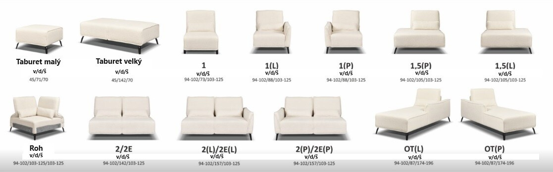 Souprava je vybavena přenastavitelnými opěradly, které poskytují jejich možnou změnu . Sedací suprava nemá el. podnožník.