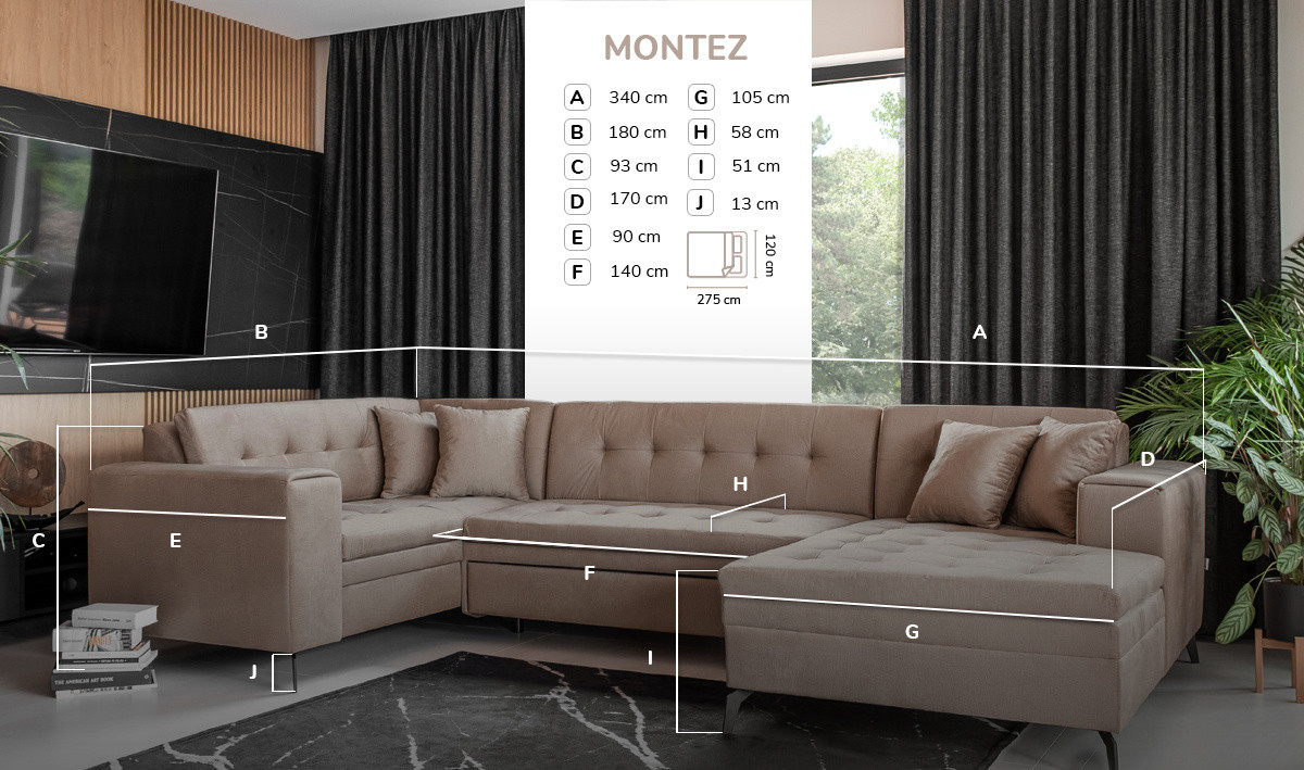 Rohová sedací souprava Montez je vyrobena z kvalitních materiálů. Konstrukce sedací soupravy je vyrobena z kombinace dřeva a dřevotřísky. Sedací část je vyrobena v kombinaci polyuretanové pěny T3040, polyuretanové pěny T2542 a bonelů Faliste. Sedací souprava je rozkládací pomocí rozkladu Delfín. Sedací souprava má prostorný úložný prostor pro úschovu lůžkovin.