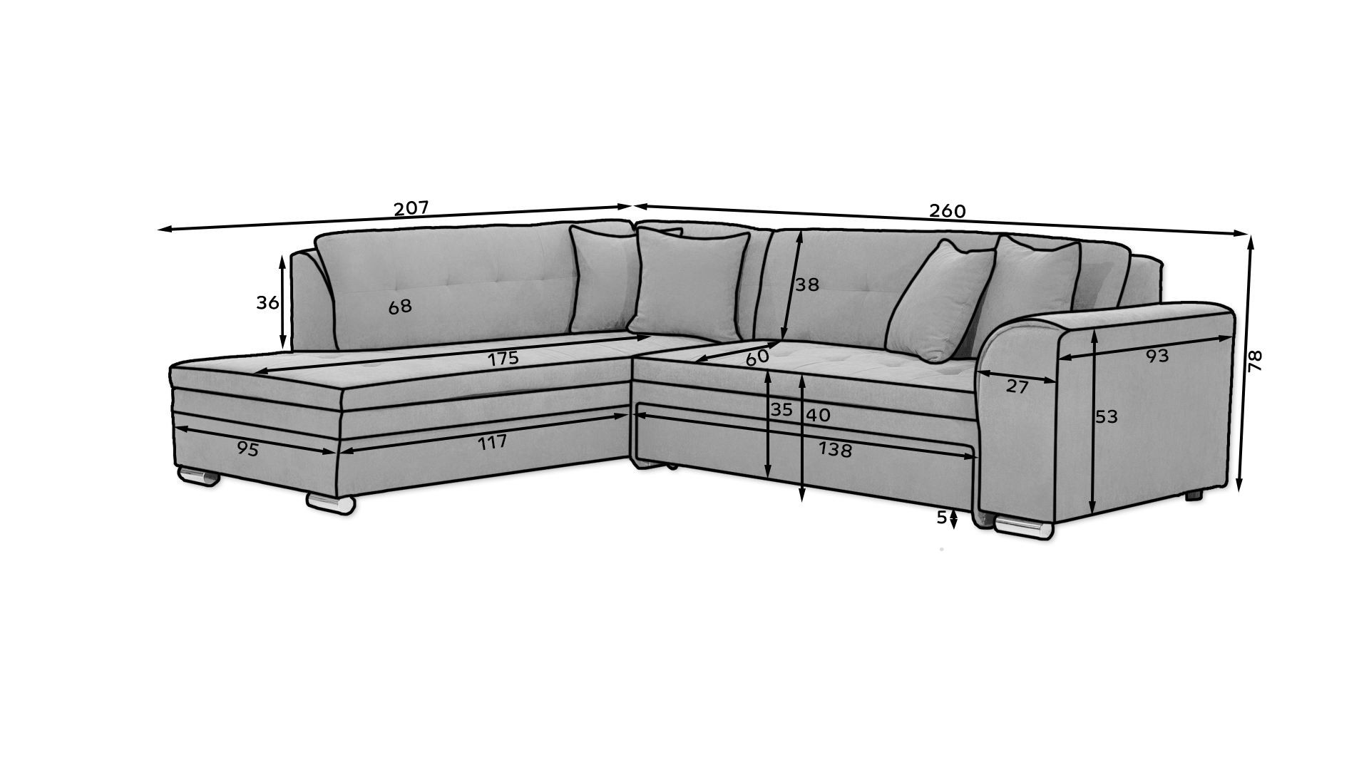 Rohová sedací souprava Pieretta je vyrobena z kvalitních materiálů. Konstrukce sedací soupravy je vyrobena z dřeva. Sedací část je vyrobena v kombinaci polyuretanové pěny T3030 a vlnitých pružin. Sedací souprava je rozkládací pomocí rozkládacího mechanismu typu Delfín.