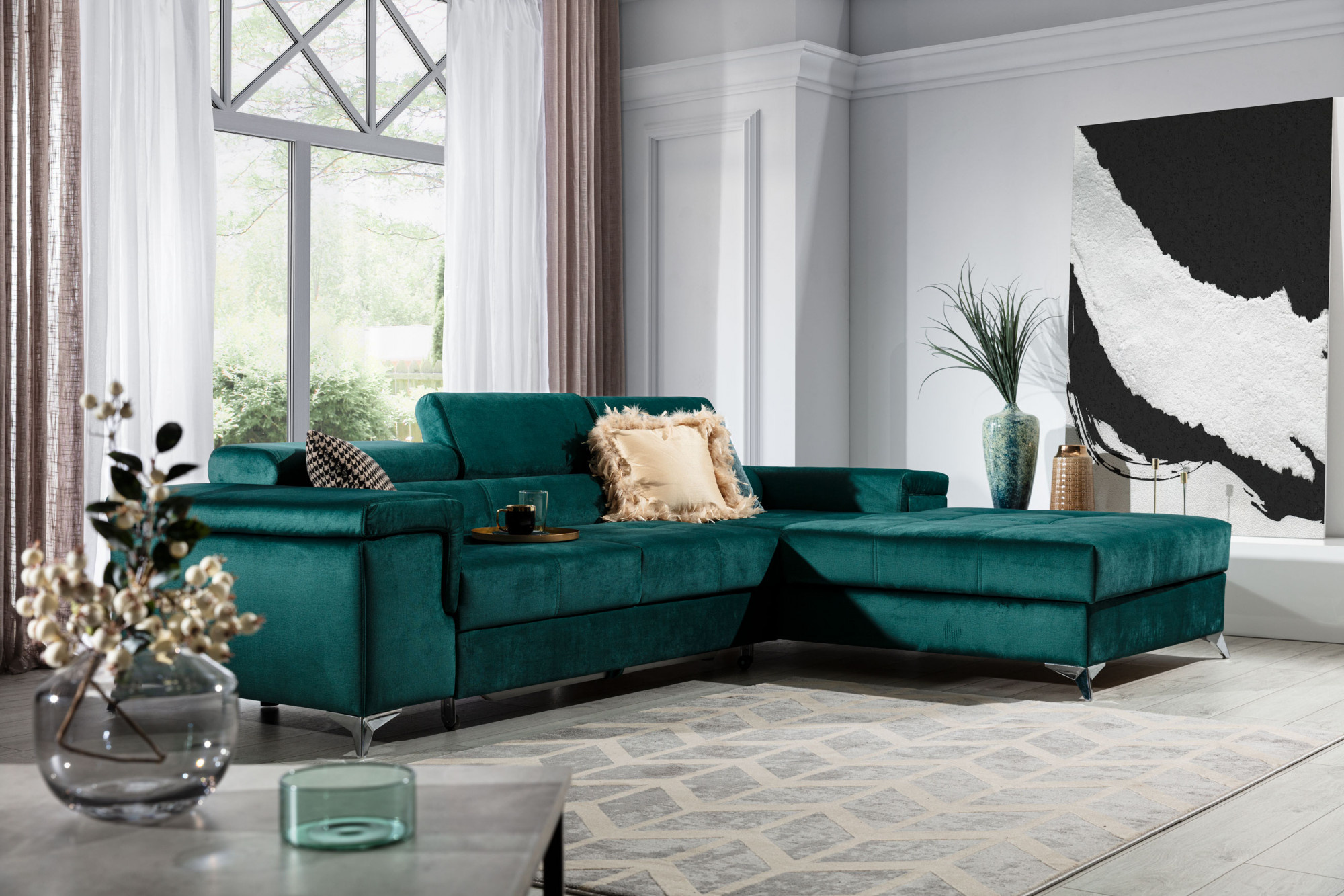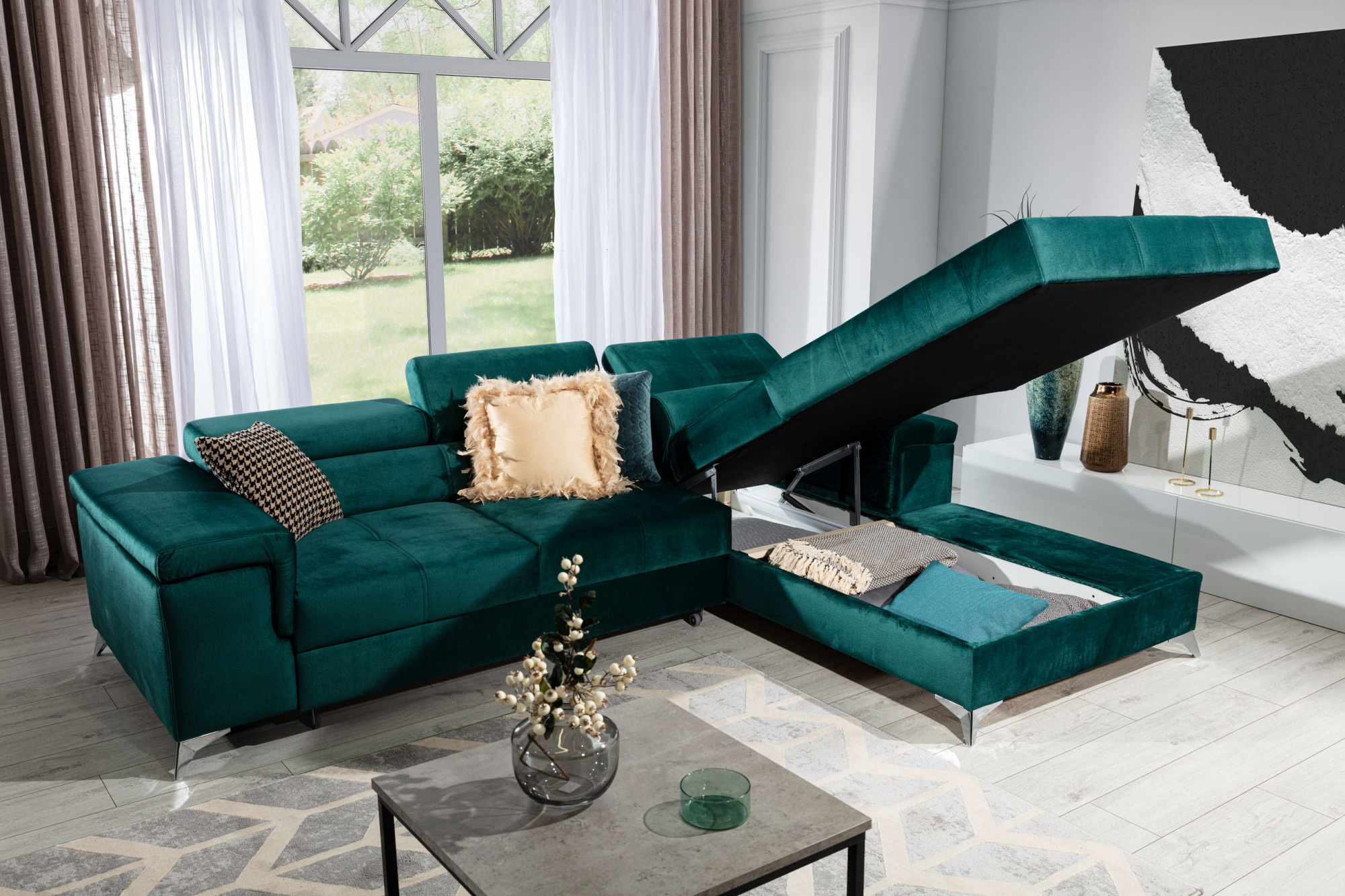 - možnost ustavení sedací soupravy do prostoru - záda sedací soupravy jsou očalouněny stejnou potahovou látkou