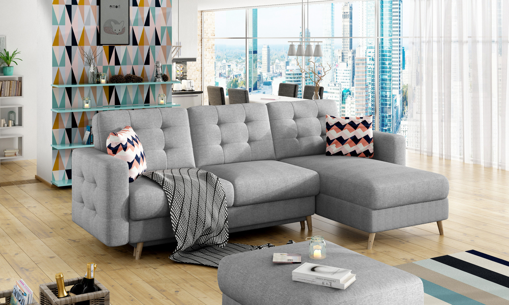 Rohová sedací souprava ASGARD L je UNIVERSÁLNÍ - stranu rohu si můžete měnit podle Vašeho přání. Sedací souprava je vyrobena z kvalitních materiálů. Konstrukce sedací soupravy je vyrobena z kombinace dřeva a lamina. Sedací část je vyrobena z polyuretanové pěny T3040 a pružin, opěrná část je vyrobena z polyuretanové pěny T2542. Sedací souprava má úložný prostor pro úschovu lůžkovin.