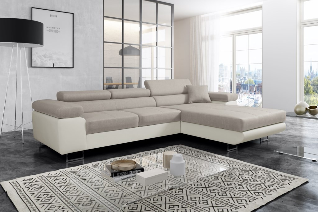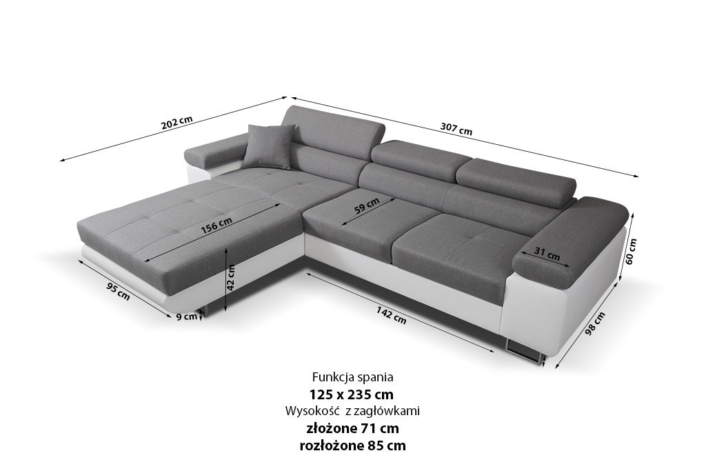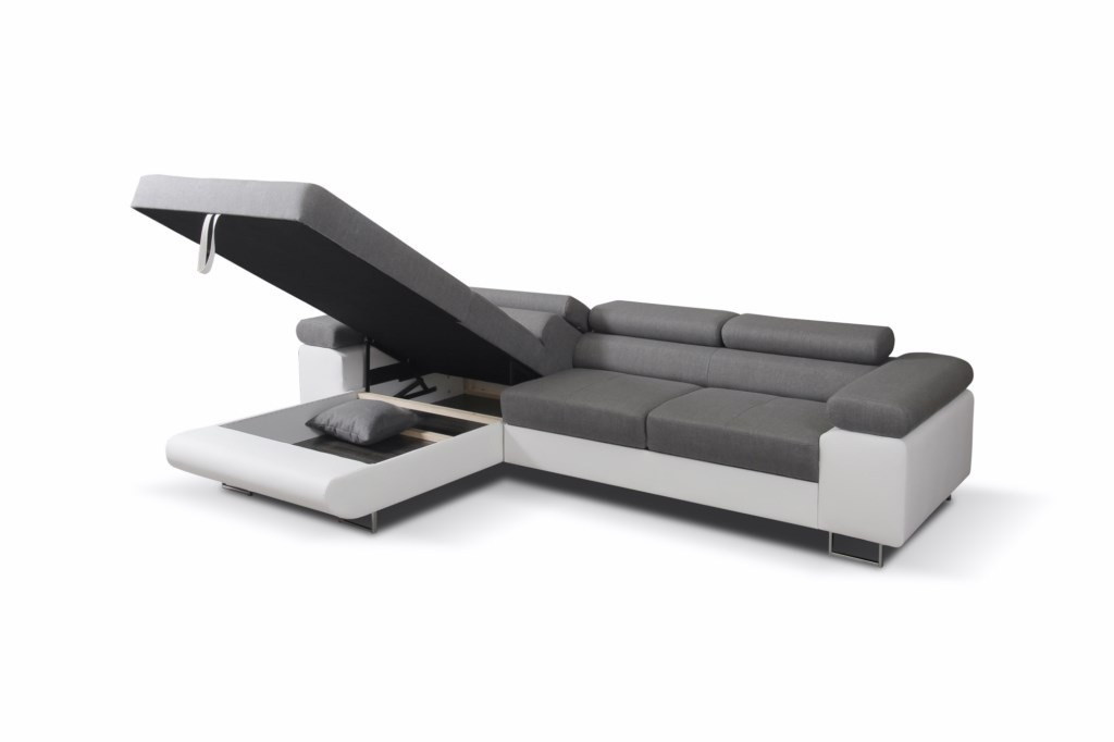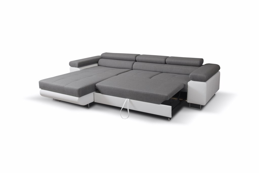 Rohová sedačka má funkci spaní a úložný prostor na lůžkoviny. Nohy v rohu jsou chromované. Rohová sedačka má 3 nastavitelné opěrky hlavy, ozdobné prošívání a knoflíky na sedáku. Byl vyroben na vlnitých pružinách + vysoce elastická pěna typ T30. Lze objednat libovolnou stranu rohové sedačky. Stranu rohové sedačky vybíráme při pohledu zepředu na fotografii. ROZMĚRY: šířka: 307 cm výška: 90 cm hloubka: 202 cm plocha na spaní: 125 cm x 200 cm Všechny rozměry jsou uváděny s tolerancí +/- 3 cm.