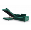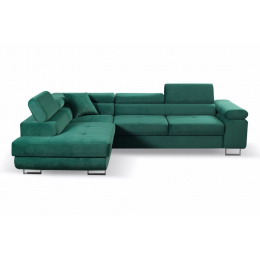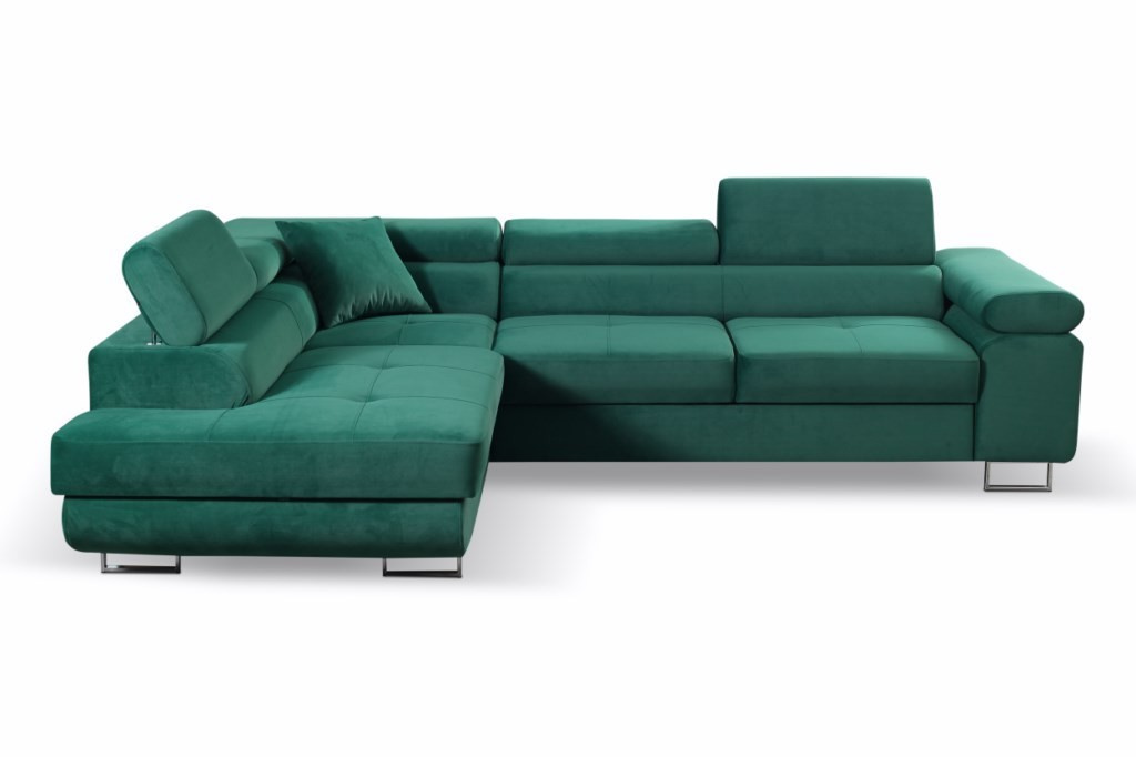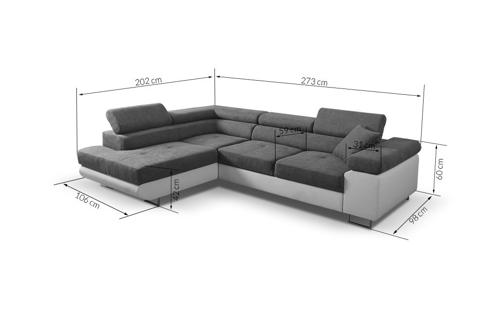 Rohová sedačka má funkci spaní a úložný prostor na lůžkoviny. Nohy v rohu jsou chromované. Rohová sedačka má 3 nastavitelné opěrky hlavy, ozdobné prošívání a knoflíky na sedáku. Byl vyroben na vlnitých pružinách + vysoce elastická pěna typ T30. Lze objednat libovolnou stranu rohové sedačky. Stranu rohové sedačky vybíráme při pohledu zepředu na fotografii. ROZMĚRY: šířka: 273 cm výška: 90 cm hloubka: 202 cm plocha na spaní: 125 cm x 200 cm Všechny rozměry jsou uváděny s tolerancí +/- 3 cm.