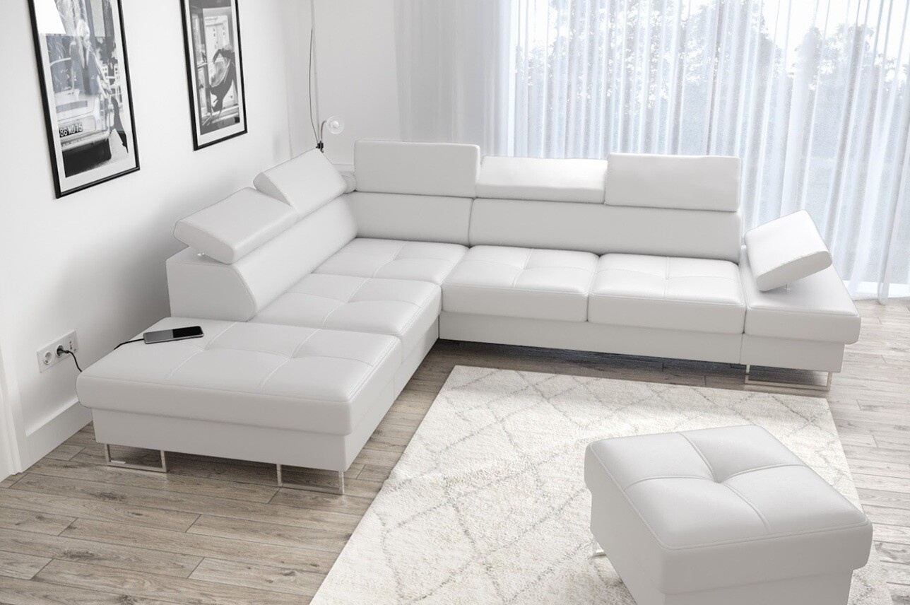 ROHOVÁ POHOVKA GALAXY S FUNKCÍ SPÁNKU 225X280 PŘÍRODNÍ KŮŽE. Rohová pohovka Galaxy je stylovou volbou, která zaujme svým jednoduchým a nadčasovým designem s nádechem modernity. Ceníte si pohodlí, ale nechcete obětovat moderní design? Rohová pohovka Galaxy kombinuje pohodlí s osobitým vzhledem a splňuje očekávání i těch nejnáročnějších zákazníků. VLASTNOSTI: Automatická funkce delfínového spaní - snadno promění pohovku v postel pro hosty. Přihrádka na ložní prádlo vyrobená výhradně z laminované desky - další úložný prostor. Dekorativní prošívání a prošívání na sedácích - esteticky zpracované s důrazem na nejmenší detail. Dvě možnosti nohou na výběr: kovové rámy ve stříbrné nebo černé barvě. Nastavitelné opěrky hlavy (pevná rohová opěrka hlavy) - umožňují nastavit nábytek do nejpohodlnější polohy. Nastavitelná loketní opěrka - navíc umožňuje nastavit nejpohodlnější polohu těla při odpočinku. VÝROBA: Všechny prvky produktu jsou prošity silným prošíváním, které dodává dekorativní detaily a zpevňuje spoje látek. Sedadla jsou vyrobena z vlnitých pružin a vysoce pružné pěny (kombinace nejkvalitnějších pěn T35 a HR), díky čemuž jsou středně měkká, ale zároveň velmi odolná. Rámy jsou vyrobeny ze dřeva a nábytkové desky, takže náš nábytek je robustní a cena jde vždy ruku v ruce s kvalitou.