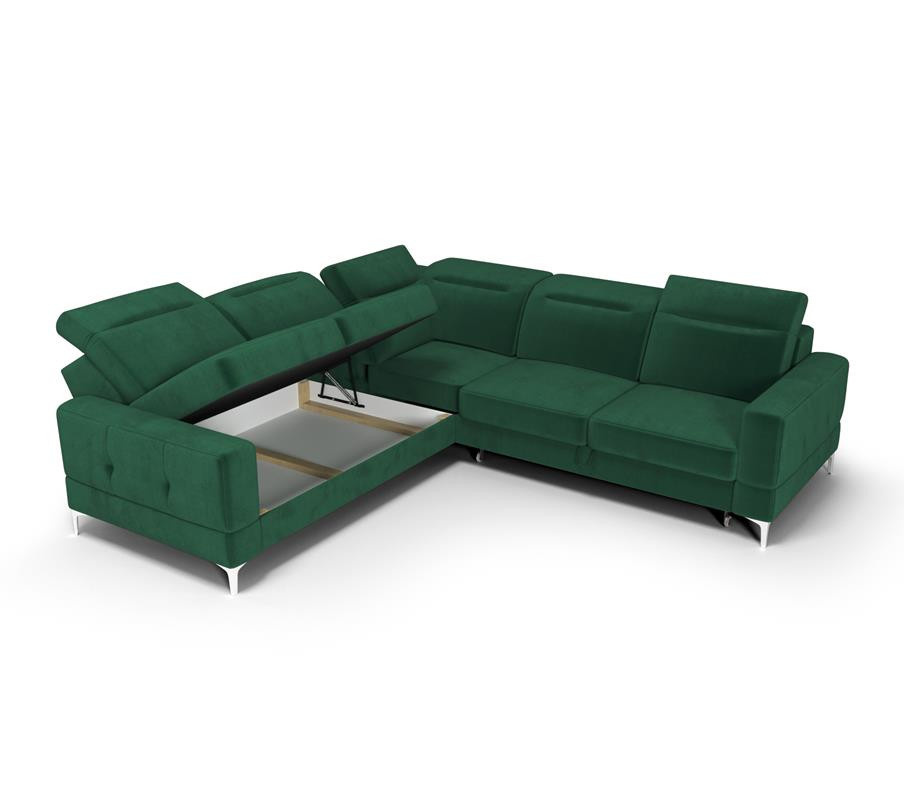 Rohová sedačka má nastavitelné, vícestupňové opěrky hlavy, chromované ozdobné nožky, sedáky s ozdobným prošíváním, které jsou vyrobeny na vlnitých pružinách a vysoce elastické pěně, což zajišťuje vysoký komfort používání a zabraňuje deformaci nejčastěji používaných ploch. Stranu rohové sedačky určuje úložný prostor na lůžkoviny. Kontejner vpravo - pravá strana, kontejner vlevo - levá strana (stojíc čelem k nábytku).