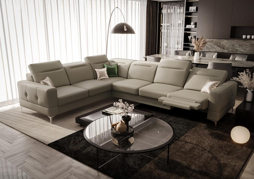 Rohová sedačka má nastavitelné, vícestupňové opěrky hlavy, chromované ozdobné nožky, sedáky s ozdobným prošíváním, které jsou vyrobeny na vlnitých pružinách a vysoce elastické pěně, což zajišťuje vysoký komfort používání a zabraňuje deformaci nejčastěji používaných ploch.