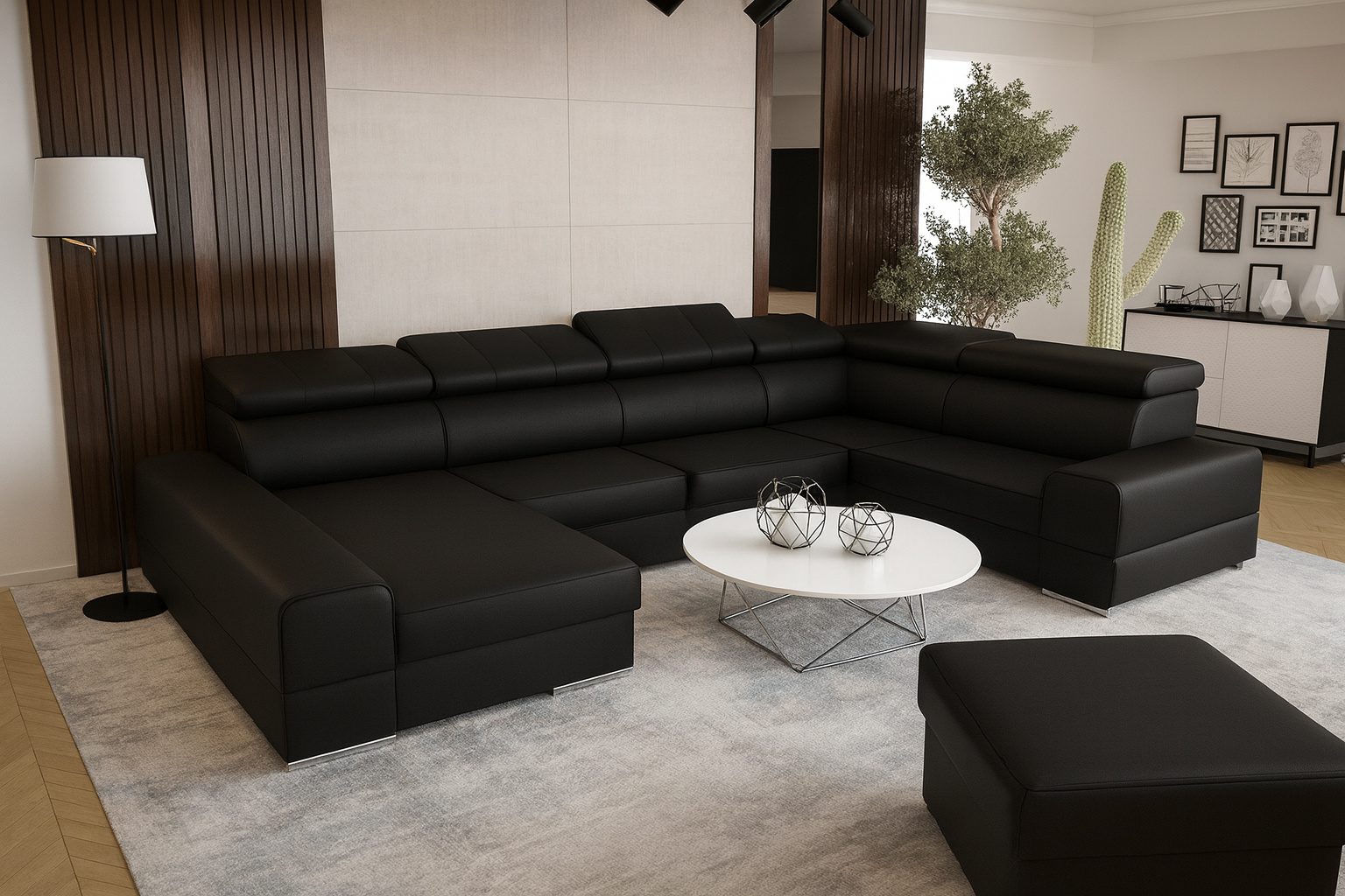 Rohová sedací souprava ROYAL MAX II průměr 230x375x185 přírodní kůže - černá kůže , pravá