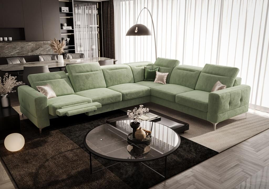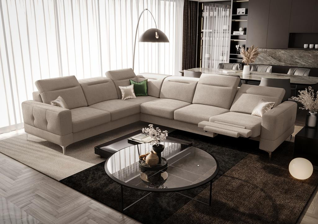 Rohová sedačka má nastavitelné, vícestupňové opěrky hlavy, chromované ozdobné nožky, sedáky s ozdobným prošíváním, které jsou vyrobeny na vlnitých pružinách a vysoce elastické pěně, což zajišťuje vysoký komfort používání a zabraňuje deformaci nejčastěji používaných ploch.