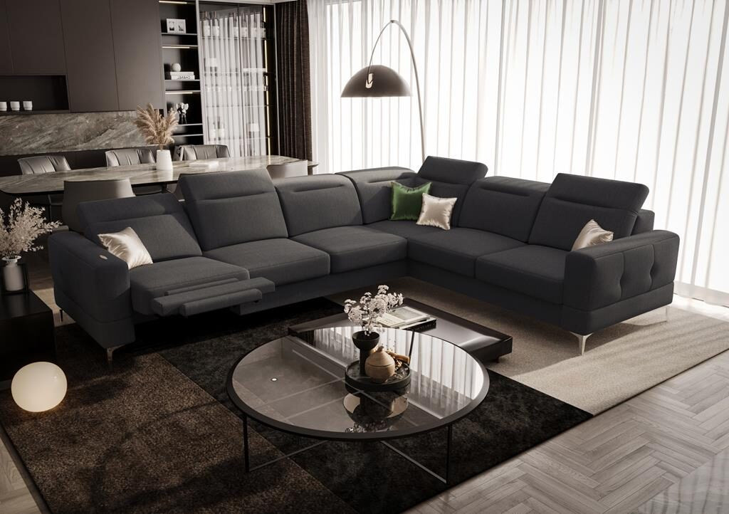 Rohová sedačka má nastavitelné, vícestupňové opěrky hlavy, chromované ozdobné nožky, sedáky s ozdobným prošíváním, které jsou vyrobeny na vlnitých pružinách a vysoce elastické pěně, což zajišťuje vysoký komfort používání a zabraňuje deformaci nejčastěji používaných ploch.