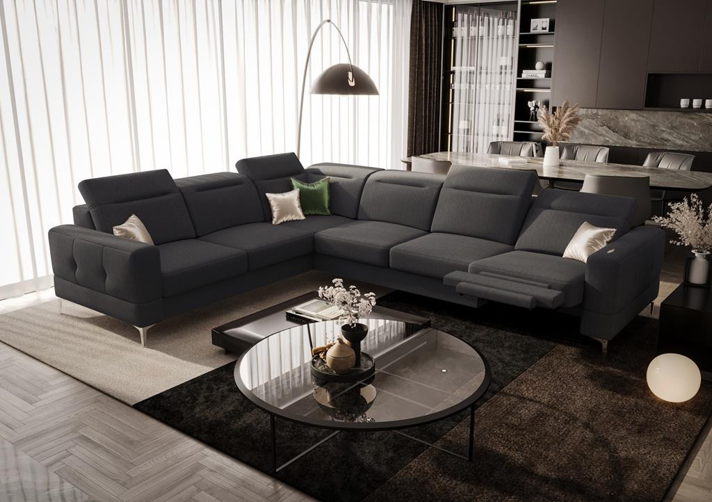 Rohová sedačka má nastavitelné, vícestupňové opěrky hlavy, chromované ozdobné nožky, sedáky s ozdobným prošíváním, které jsou vyrobeny na vlnitých pružinách a vysoce elastické pěně, což zajišťuje vysoký komfort používání a zabraňuje deformaci nejčastěji používaných ploch.