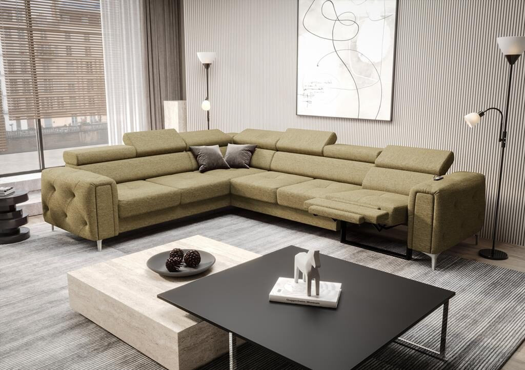 Rohová sedačka s relaxační funkcí Orion I s funkcí spaní, nastavitelnými opěrkami hlavy, ozdobným prošíváním a možností výběru nohou je dokonalým spojením komfortu a elegance. Úložný prostor na ložní prádlo a prošívaná strana ve stylu glamour z něj činí výjimečný kus nábytku, který splní očekávání i těch nejnáročnějších uživatelů. Prohlédni si celou kolekci Orion. Vyberte si rohovou sedačku, která dodá vašemu interiéru jak funkčnost, tak styl.