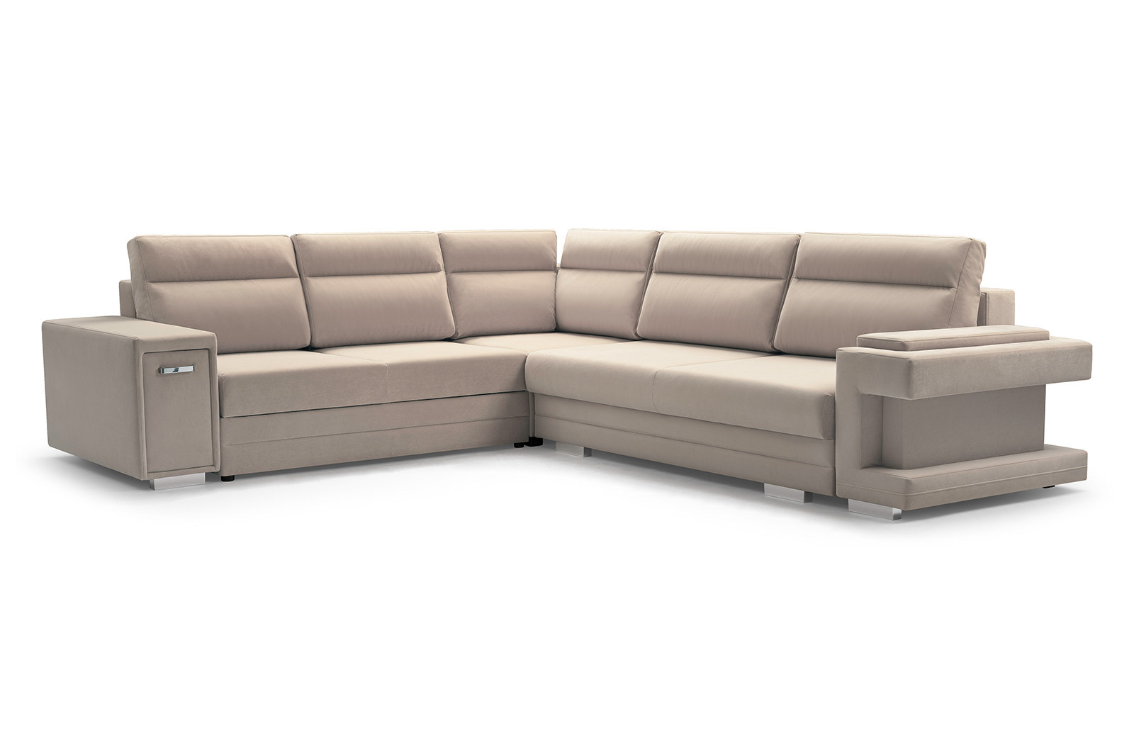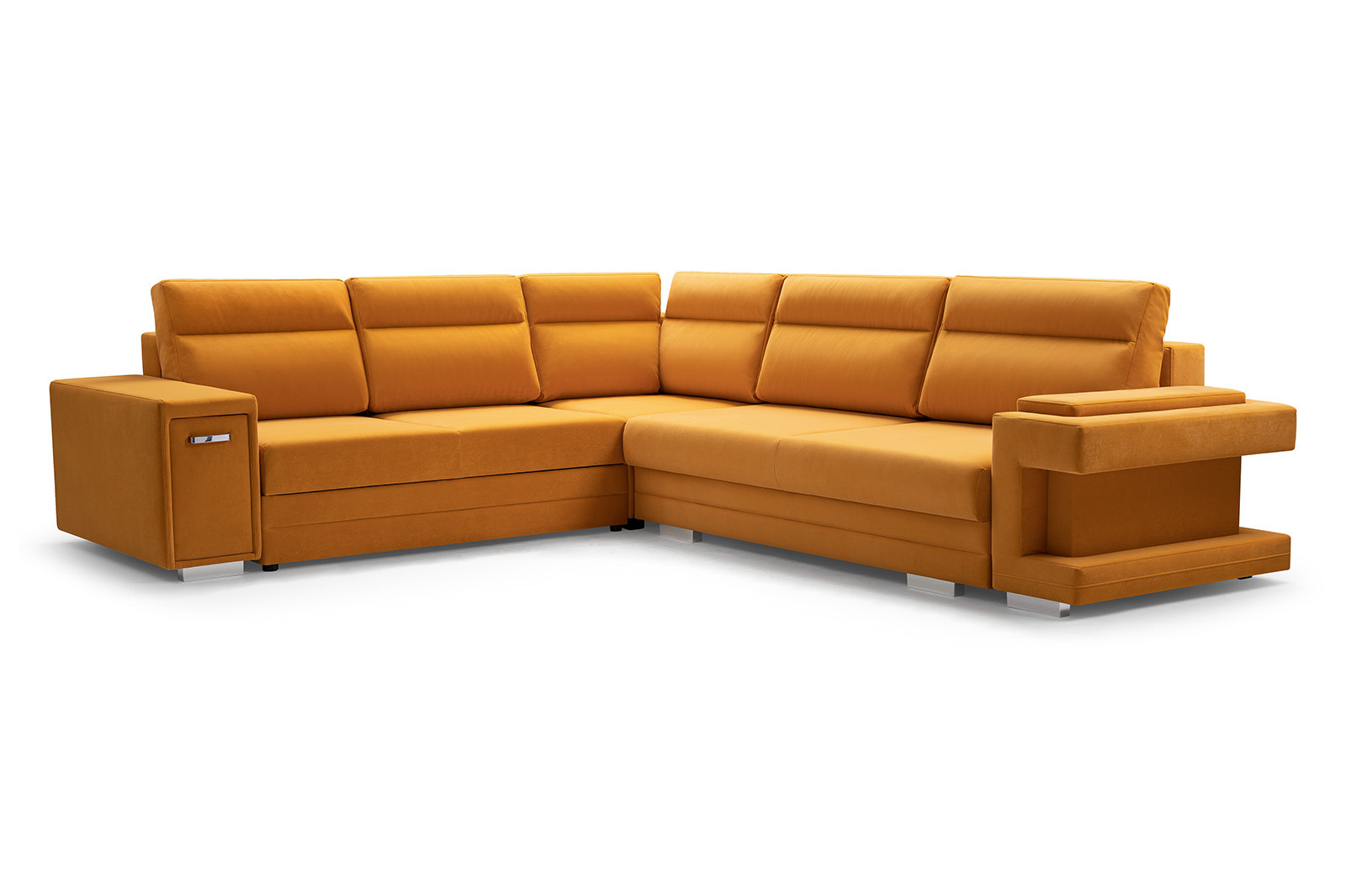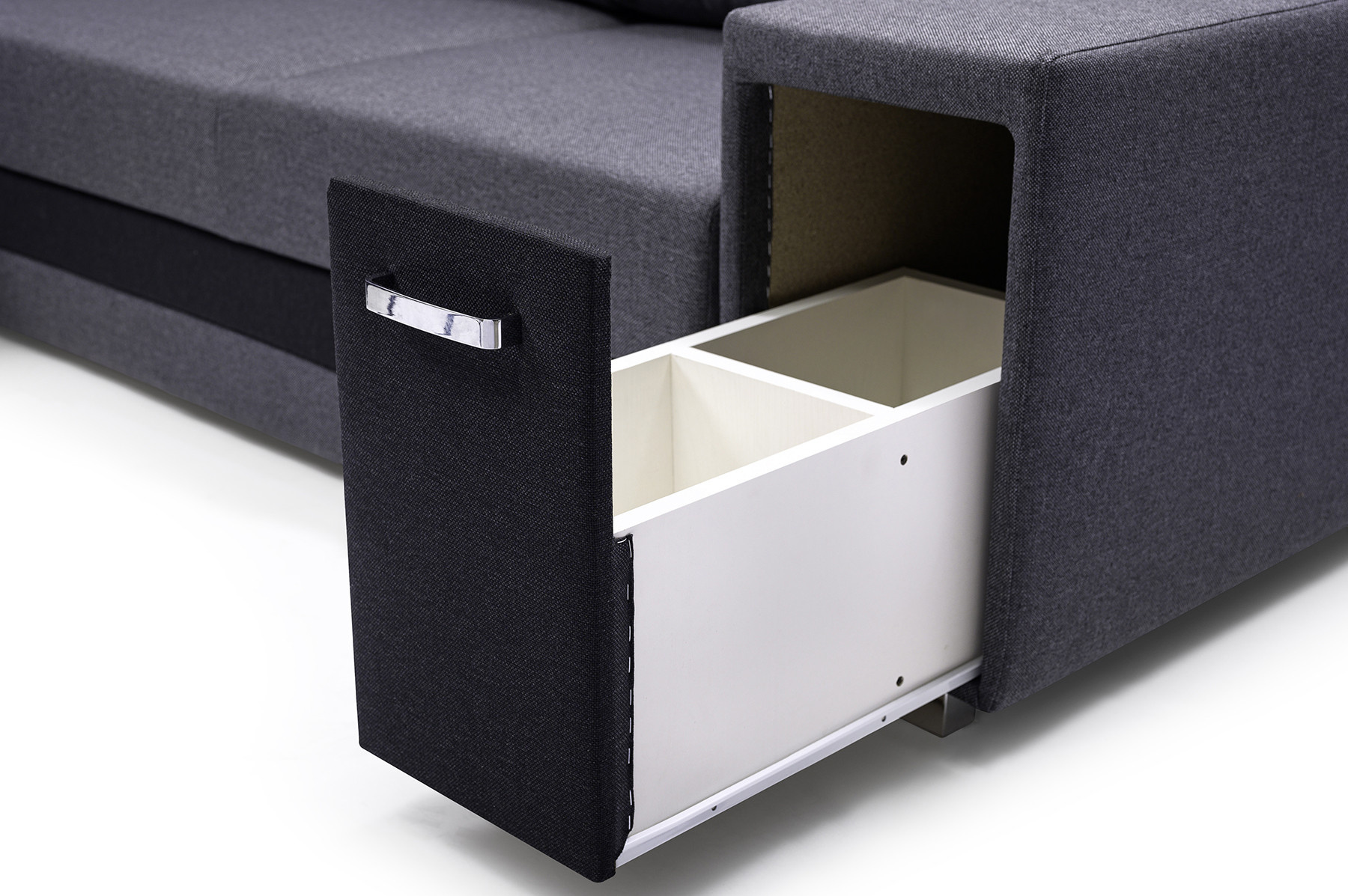 Rozkládací pohovka A2 ve tvaru písmene L je k dispozici v pravém i levém provedení, takže si ji každý bude moci přizpůsobit tvaru a rozměrům zařízeného interiéru. Model A2 s funkcí spaní je vybaven automatickou jednotkou MOS pro snadné rozložení; pod sedadlem je k dispozici prostorný úložný prostor na lůžkoviny. Rohová pohovka stojí na dřevěném rámu a chromovaných nohách, které zajišťují odolnost a stabilitu nábytku. Volně stojící kus nábytku A2 je na sedáku a opěráku vyplněn vlnitou pružinou a čalounickou pěnou T-30, které zajišťují odpovídající pružnost. Součástí rohové sedací soupravy jsou polštáře, které lze umístit na opěradlo - jsou ozdobně prošité a dodávají jí moderní vzhled. Nábytek je čalouněný látkou, jejíž barvy si lze vybrat podle individuálních preferencí ze vzorníku barev. Rohovou sedací soupravu s bočnicemi lze umístit jak do rohu místnosti, tak do jejího středu - zadní část nábytku je navíc esteticky čalouněná. Model A2 má dva vestavěné praktické úložné prostory - jeden je k dispozici ve formě výsuvné zásuvky, druhý je umístěn v jedné z područek. Rohová sedačka pro více osob nejen podtrhne jedinečný charakter zařízeného interiéru, ale také poskytne pohodlí a komfort i při mnohahodinovém odpočinku po náročném dni.
