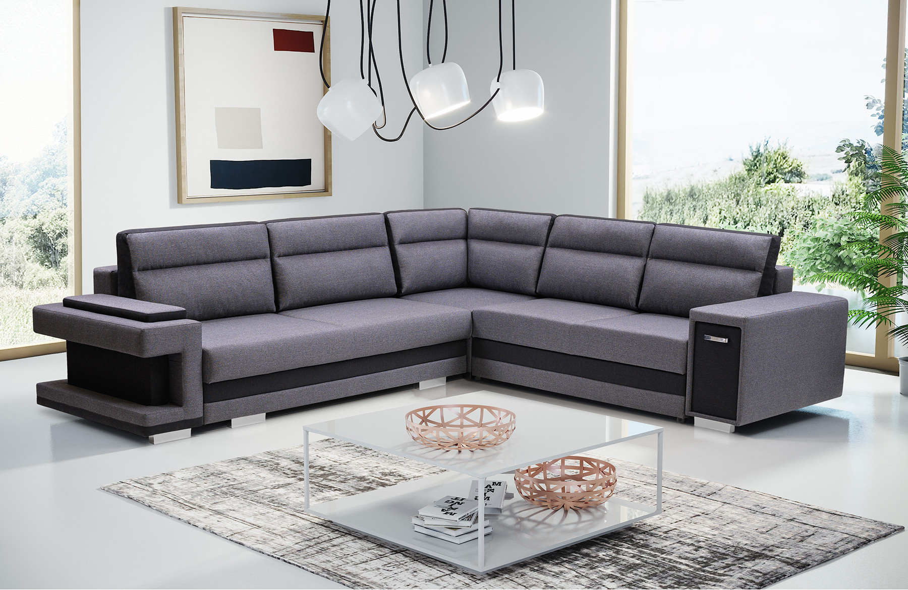 Rozkládací pohovka A2 ve tvaru písmene L je k dispozici v pravém i levém provedení, takže si ji každý bude moci přizpůsobit tvaru a rozměrům zařízeného interiéru. Model A2 s funkcí spaní je vybaven automatickou jednotkou MOS pro snadné rozložení; pod sedadlem je k dispozici prostorný úložný prostor na lůžkoviny. Rohová pohovka stojí na dřevěném rámu a chromovaných nohách, které zajišťují odolnost a stabilitu nábytku. Volně stojící kus nábytku A2 je na sedáku a opěráku vyplněn vlnitou pružinou a čalounickou pěnou T-30, které zajišťují odpovídající pružnost. Součástí rohové sedací soupravy jsou polštáře, které lze umístit na opěradlo - jsou ozdobně prošité a dodávají jí moderní vzhled. Nábytek je čalouněný látkou, jejíž barvy si lze vybrat podle individuálních preferencí ze vzorníku barev. Rohovou sedací soupravu s bočnicemi lze umístit jak do rohu místnosti, tak do jejího středu - zadní část nábytku je navíc esteticky čalouněná. Model A2 má dva vestavěné praktické úložné prostory - jeden je k dispozici ve formě výsuvné zásuvky, druhý je umístěn v jedné z područek. Rohová sedačka pro více osob nejen podtrhne jedinečný charakter zařízeného interiéru, ale také poskytne pohodlí a komfort i při mnohahodinovém odpočinku po náročném dni.