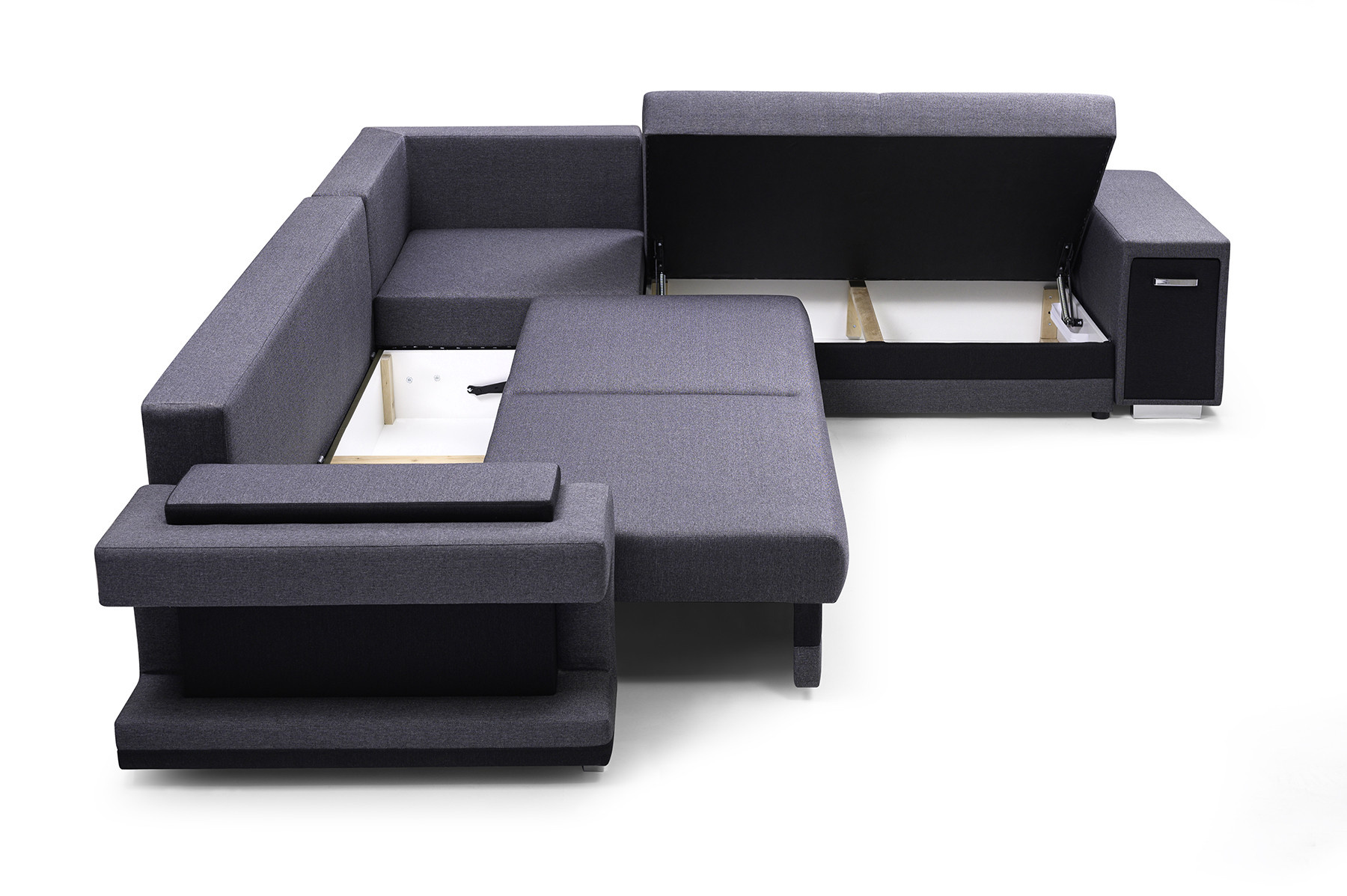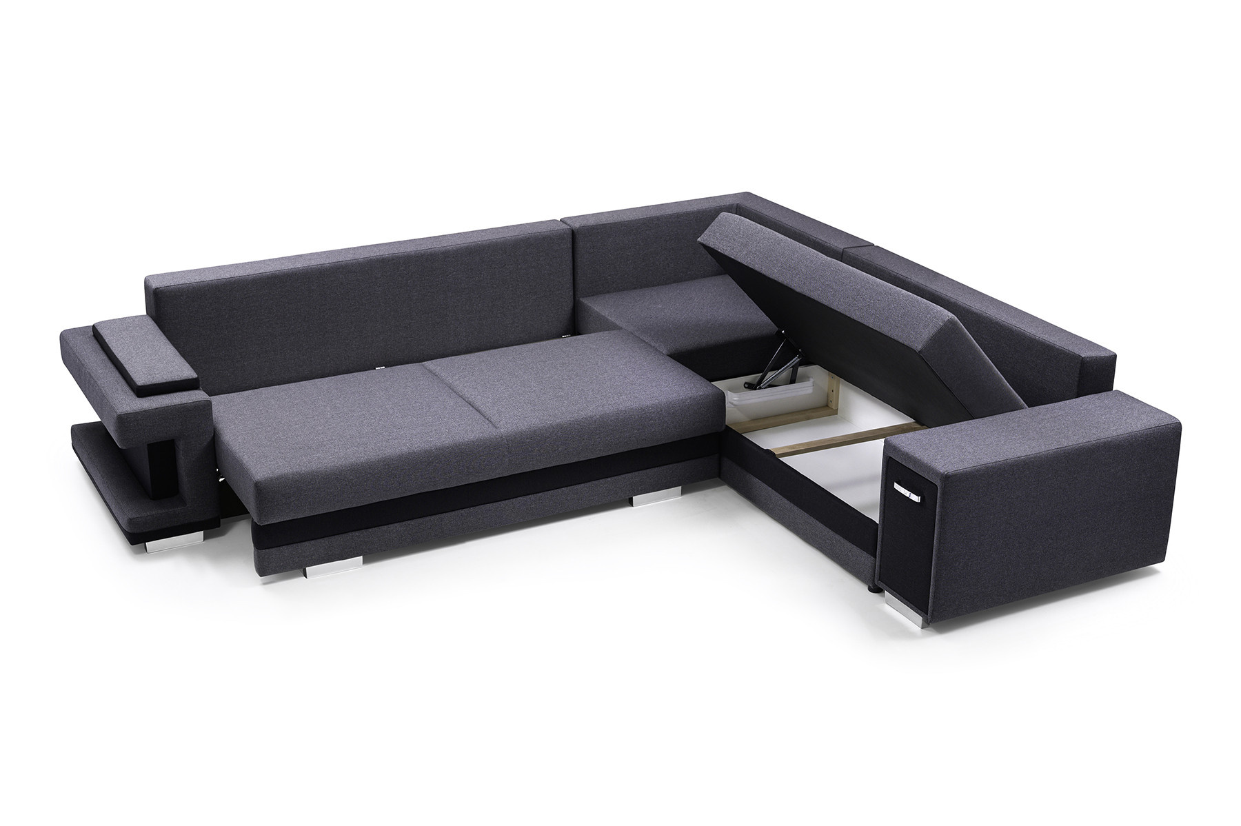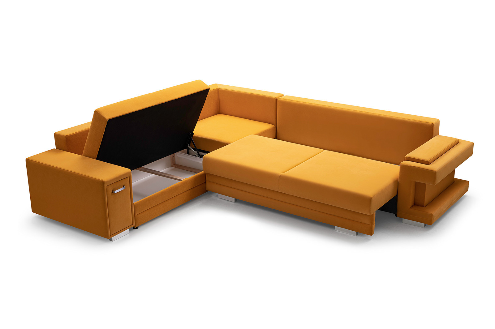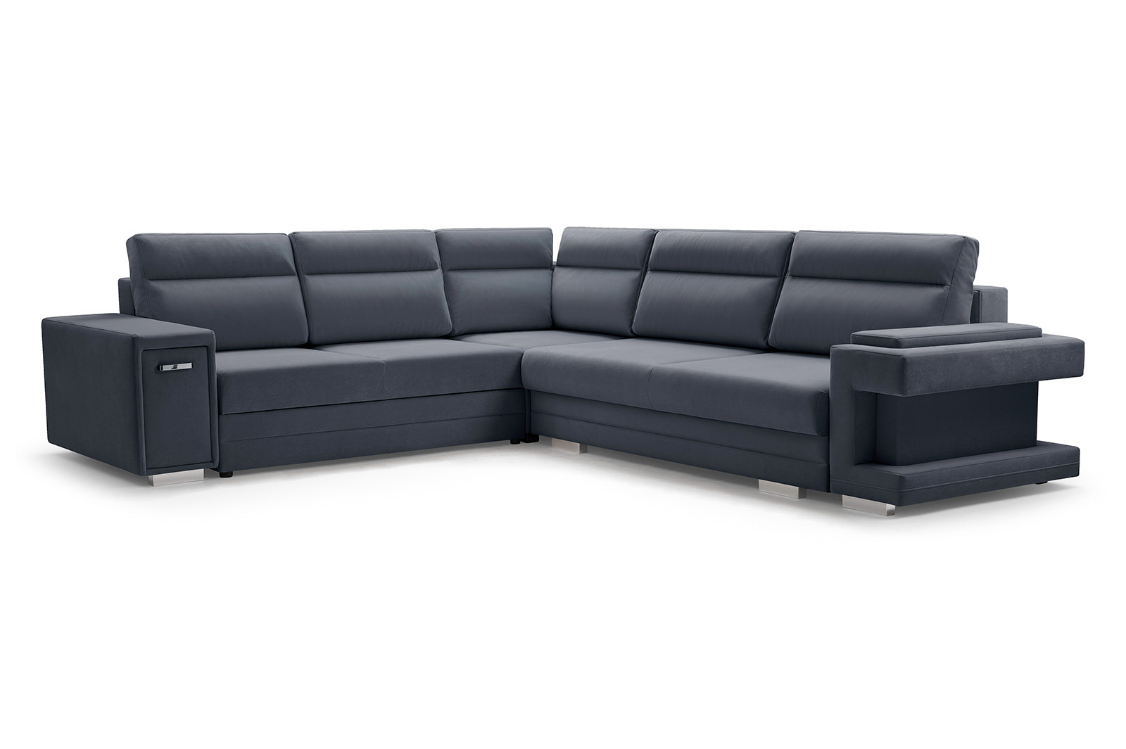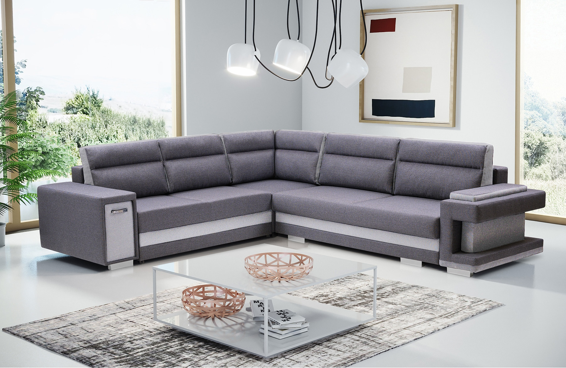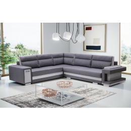 Rozkládací pohovka A2 ve tvaru písmene L je k dispozici v pravém i levém provedení, takže si ji každý bude moci přizpůsobit tvaru a rozměrům zařízeného interiéru. Model A2 s funkcí spaní je vybaven automatickou jednotkou MOS pro snadné rozložení; pod sedadlem je k dispozici prostorný úložný prostor na lůžkoviny. Rohová pohovka stojí na dřevěném rámu a chromovaných nohách, které zajišťují odolnost a stabilitu nábytku. Volně stojící kus nábytku A2 je na sedáku a opěráku vyplněn vlnitou pružinou a čalounickou pěnou T-30, které zajišťují odpovídající pružnost. Součástí rohové sedací soupravy jsou polštáře, které lze umístit na opěradlo - jsou ozdobně prošité a dodávají jí moderní vzhled. Nábytek je čalouněný látkou, jejíž barvy si lze vybrat podle individuálních preferencí ze vzorníku barev. Rohovou sedací soupravu s bočnicemi lze umístit jak do rohu místnosti, tak do jejího středu - zadní část nábytku je navíc esteticky čalouněná. Model A2 má dva vestavěné praktické úložné prostory - jeden je k dispozici ve formě výsuvné zásuvky, druhý je umístěn v jedné z područek. Rohová sedačka pro více osob nejen podtrhne jedinečný charakter zařízeného interiéru, ale také poskytne pohodlí a komfort i při mnohahodinovém odpočinku po náročném dni.