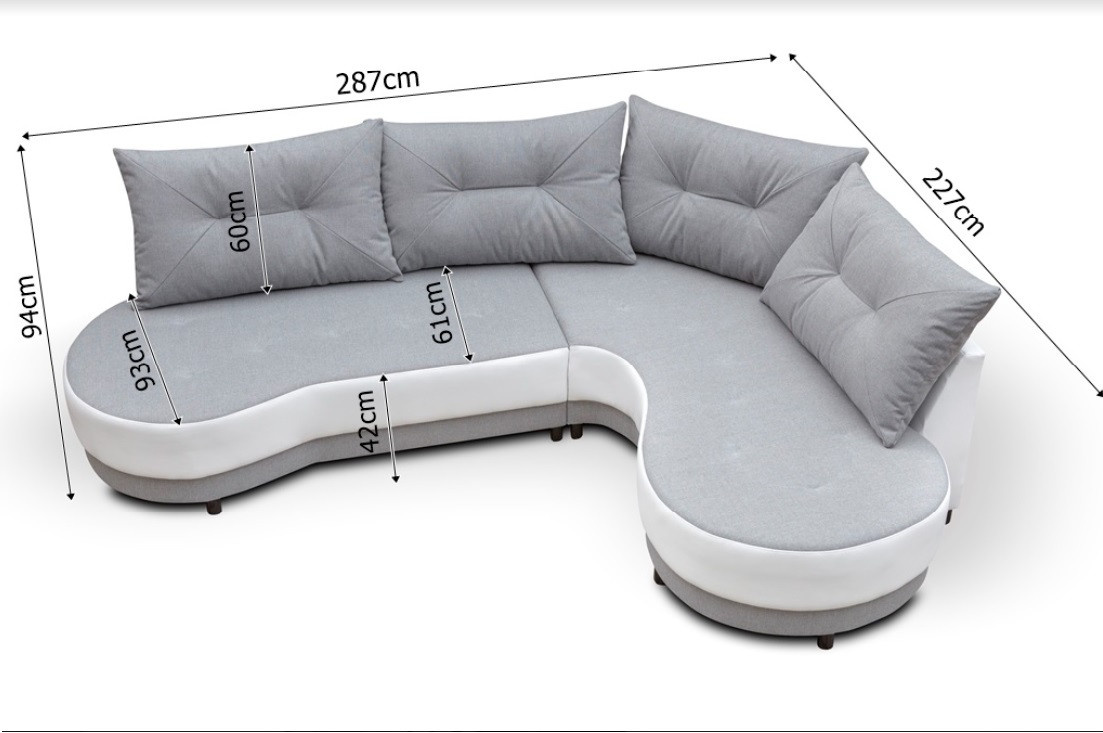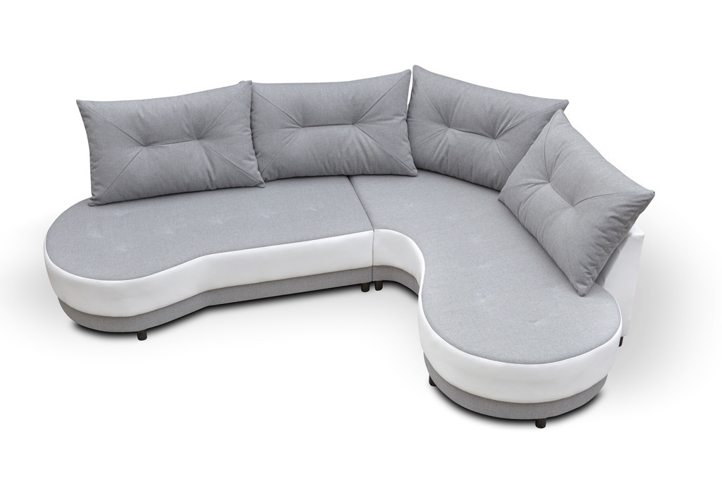 Rohová sedací souprava ABI se zaobleným tvarem sedáku je kus nábytku ve tvaru písmene L. Rohová sedací souprava je k dispozici v pravostranném nebo levostranném provedení, takže ji lze bez větších problémů přizpůsobit uspořádanému interiéru. Rohová pohovka bez bočnic je volně stojící kus nábytku s čalouněným opěradlem, který lze umístit i do centrální části místnosti, nikoli jen ke stěně. Nábytek má dřevěný rám a plastové nohy v černé barvě, které mu dodávají stylový charakter. Součástí modelu ABI jsou ozdobné polštáře s dekorativním prošíváním, které nejen podtrhnou moderní estetiku nábytku, ale také zajistí pohodlí uživatele i při mnohahodinovém sezení. Stylová rohová sedací souprava ABI je vyplněna vlnitou pružinou a čalounickou pěnou T-30, která jí dodává odpovídající pružnost, díky níž se na nábytku neobjeví žádné nevzhledné deformace nebo otlaky způsobené každodenním používáním. Rohovou pohovku pro více osob lze čalounit látkou Magic Home odolnou proti skvrnám, která je k dispozici ve druhé cenové skupině. V základní verzi rohové sedací soupravy jsou vložky vyrobeny z bílé ekokůže - je možné zvolit jiný materiál. Představená rohová sedací souprava se bude skvěle vyjímat v obývacím pokoji nebo obývacím pokoji.
