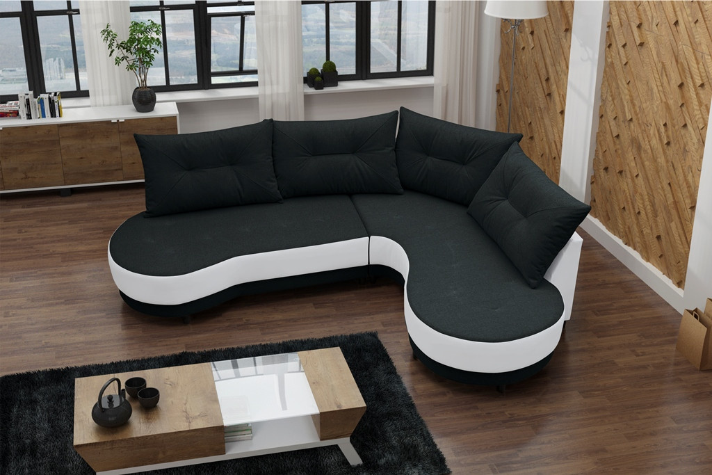 Rohová sedací souprava ABI se zaobleným tvarem sedáku je kus nábytku ve tvaru písmene L. Rohová sedací souprava je k dispozici v pravostranném nebo levostranném provedení, takže ji lze bez větších problémů přizpůsobit uspořádanému interiéru. Rohová pohovka bez bočnic je volně stojící kus nábytku s čalouněným opěradlem, který lze umístit i do centrální části místnosti, nikoli jen ke stěně. Nábytek má dřevěný rám a plastové nohy v černé barvě, které mu dodávají stylový charakter. Součástí modelu ABI jsou ozdobné polštáře s dekorativním prošíváním, které nejen podtrhnou moderní estetiku nábytku, ale také zajistí pohodlí uživatele i při mnohahodinovém sezení. Stylová rohová sedací souprava ABI je vyplněna vlnitou pružinou a čalounickou pěnou T-30, která jí dodává odpovídající pružnost, díky níž se na nábytku neobjeví žádné nevzhledné deformace nebo otlaky způsobené každodenním používáním. Rohovou pohovku pro více osob lze čalounit látkou Magic Home odolnou proti skvrnám, která je k dispozici ve druhé cenové skupině. V základní verzi rohové sedací soupravy jsou vložky vyrobeny z bílé ekokůže - je možné zvolit jiný materiál. Představená rohová sedací souprava se bude skvěle vyjímat v obývacím pokoji nebo obývacím pokoji.