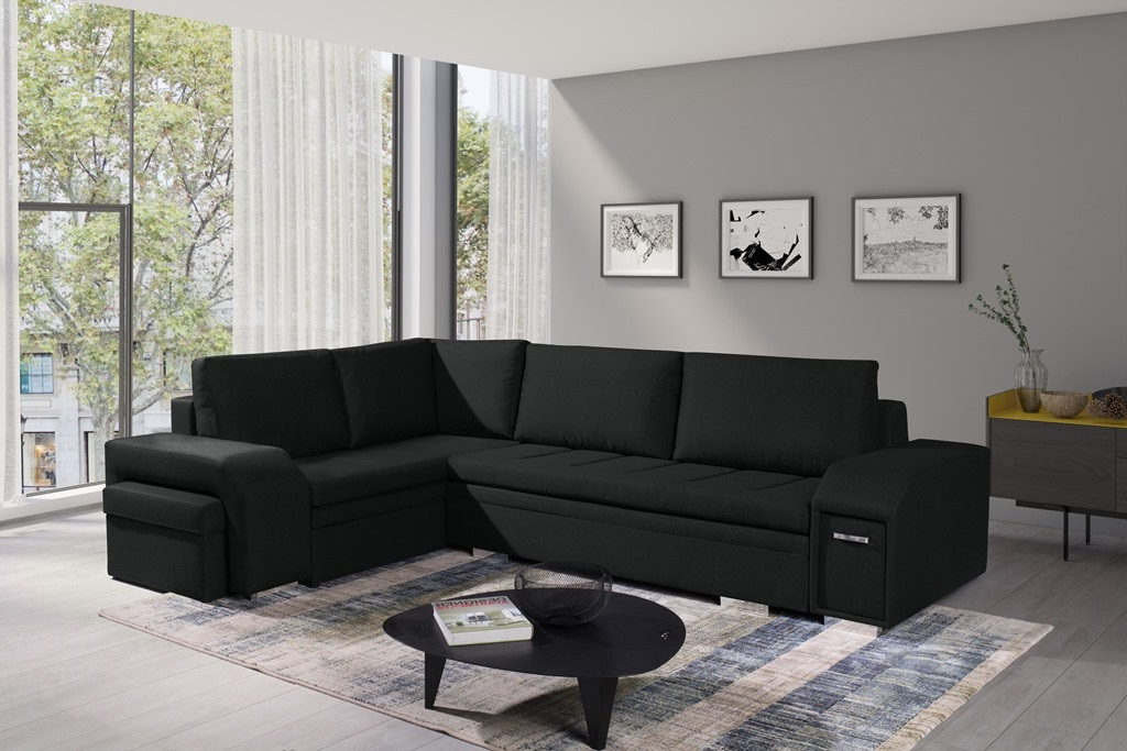 Rozkládací rohová pohovka AIL je obývací nábytek s funkcí spaní, který je k dispozici v pravé nebo levé variantě. Stylová rohová pohovka se dvěma přihrádkami na lůžkoviny je vybavena speciální automatickou funkcí pro snadné rozložení, takže budete mít rychlý přístup k přikrývkám a polštářům a zároveň si vytvoříte prostor na spaní. Rohová sedací souprava s bočnicemi je nábytek pro více osob, jehož moderní estetiku podtrhují chromované nohy. Čalouněná rohová sedací souprava do obývacího pokoje je kus nábytku s vestavěným úložným prostorem a vestavěným prostorem pro taburet, který je k dispozici v sadě. Taburet AIL bude nejen dekorativním prvkem interiéru, ale poskytne také další místo k sezení a bude užitečný i jako praktická opěrka nohou. Rohová sedací souprava s dřevěným rámem se vyznačuje zvýšenou odolností a stabilitou, díky čemuž na ní může odpočívat mnoho lidí. Dekorativně prošívaný sedák a mírně profilovaný opěrák jsou vyplněny čalounickou pěnou T-30 a vlnitými pružinami, díky nimž uživatel získá maximální pohodlí při sezení. Model AIL je nábytek vyrobený na zakázku, takže si můžete vybrat barvu čalounění podle svých individuálních preferencí.