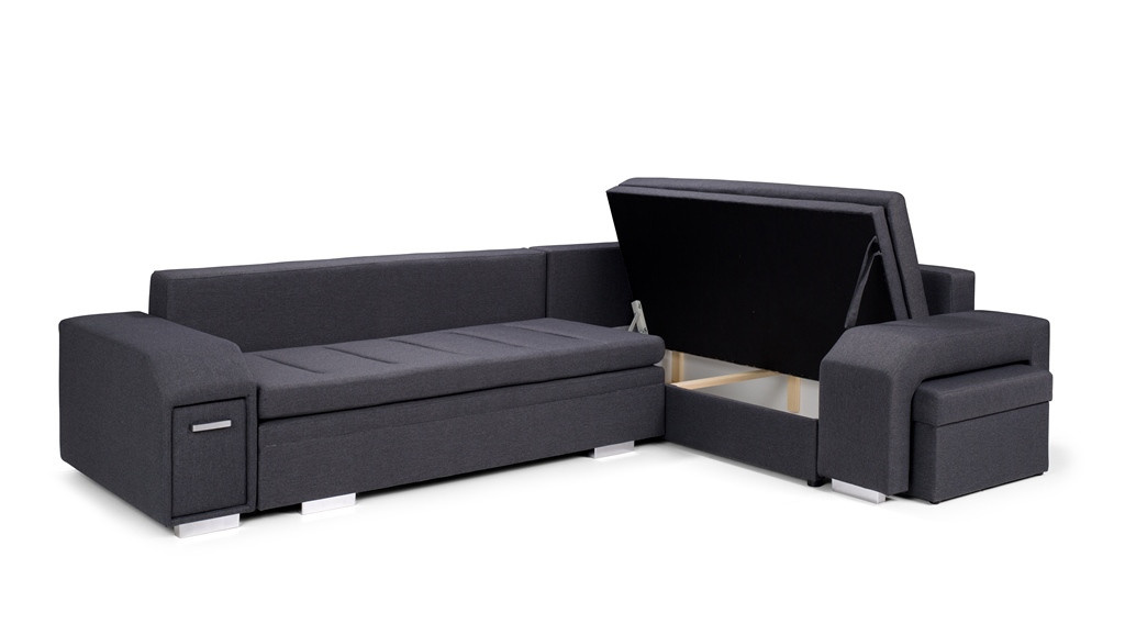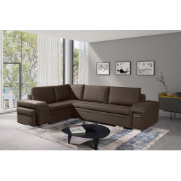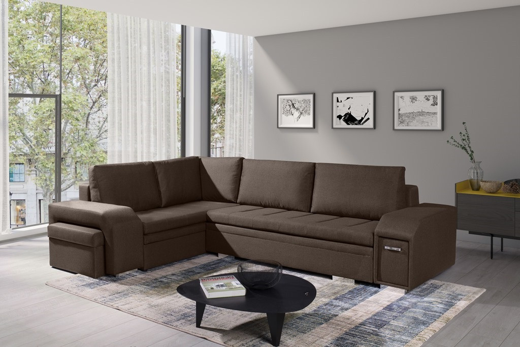 Rozkládací rohová pohovka AIL je obývací nábytek s funkcí spaní, který je k dispozici v pravé nebo levé variantě. Stylová rohová pohovka se dvěma přihrádkami na lůžkoviny je vybavena speciální automatickou funkcí pro snadné rozložení, takže budete mít rychlý přístup k přikrývkám a polštářům a zároveň si vytvoříte prostor na spaní. Rohová sedací souprava s bočnicemi je nábytek pro více osob, jehož moderní estetiku podtrhují chromované nohy. Čalouněná rohová sedací souprava do obývacího pokoje je kus nábytku s vestavěným úložným prostorem a vestavěným prostorem pro taburet, který je k dispozici v sadě. Taburet AIL bude nejen dekorativním prvkem interiéru, ale poskytne také další místo k sezení a bude užitečný i jako praktická opěrka nohou. Rohová sedací souprava s dřevěným rámem se vyznačuje zvýšenou odolností a stabilitou, díky čemuž na ní může odpočívat mnoho lidí. Dekorativně prošívaný sedák a mírně profilovaný opěrák jsou vyplněny čalounickou pěnou T-30 a vlnitými pružinami, díky nimž uživatel získá maximální pohodlí při sezení. Model AIL je nábytek vyrobený na zakázku, takže si můžete vybrat barvu čalounění podle svých individuálních preferencí.