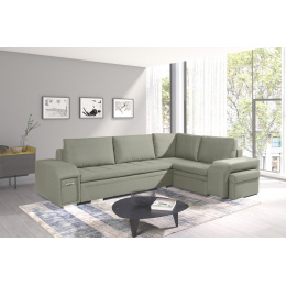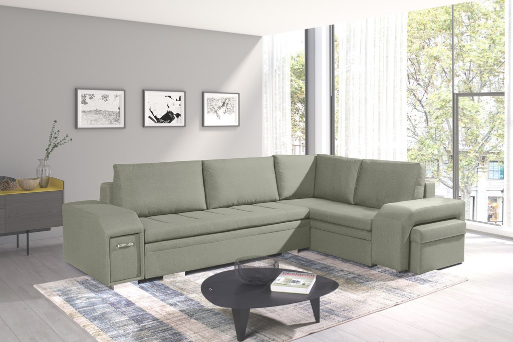 Rozkládací rohová pohovka AIL je obývací nábytek s funkcí spaní, který je k dispozici v pravé nebo levé variantě. Stylová rohová pohovka se dvěma přihrádkami na lůžkoviny je vybavena speciální automatickou funkcí pro snadné rozložení, takže budete mít rychlý přístup k přikrývkám a polštářům a zároveň si vytvoříte prostor na spaní. Rohová sedací souprava s bočnicemi je nábytek pro více osob, jehož moderní estetiku podtrhují chromované nohy. Čalouněná rohová sedací souprava do obývacího pokoje je kus nábytku s vestavěným úložným prostorem a vestavěným prostorem pro taburet, který je k dispozici v sadě. Taburet AIL bude nejen dekorativním prvkem interiéru, ale poskytne také další místo k sezení a bude užitečný i jako praktická opěrka nohou. Rohová sedací souprava s dřevěným rámem se vyznačuje zvýšenou odolností a stabilitou, díky čemuž na ní může odpočívat mnoho lidí. Dekorativně prošívaný sedák a mírně profilovaný opěrák jsou vyplněny čalounickou pěnou T-30 a vlnitými pružinami, díky nimž uživatel získá maximální pohodlí při sezení. Model AIL je nábytek vyrobený na zakázku, takže si můžete vybrat barvu čalounění podle svých individuálních preferencí.