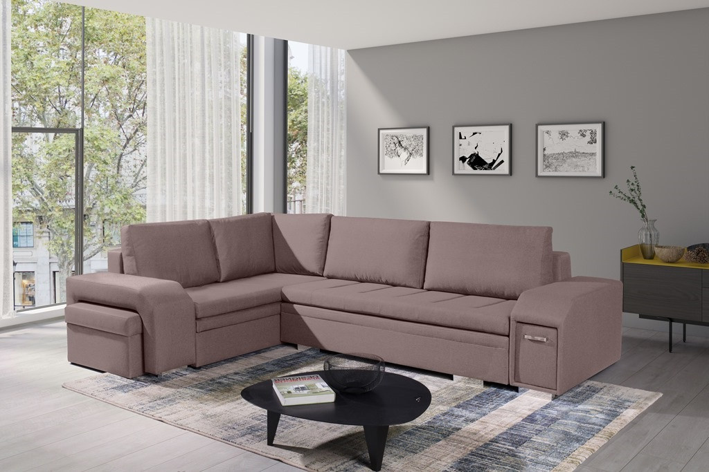 Rozkládací rohová pohovka AIL je obývací nábytek s funkcí spaní, který je k dispozici v pravé nebo levé variantě. Stylová rohová pohovka se dvěma přihrádkami na lůžkoviny je vybavena speciální automatickou funkcí pro snadné rozložení, takže budete mít rychlý přístup k přikrývkám a polštářům a zároveň si vytvoříte prostor na spaní. Rohová sedací souprava s bočnicemi je nábytek pro více osob, jehož moderní estetiku podtrhují chromované nohy. Čalouněná rohová sedací souprava do obývacího pokoje je kus nábytku s vestavěným úložným prostorem a vestavěným prostorem pro taburet, který je k dispozici v sadě. Taburet AIL bude nejen dekorativním prvkem interiéru, ale poskytne také další místo k sezení a bude užitečný i jako praktická opěrka nohou. Rohová sedací souprava s dřevěným rámem se vyznačuje zvýšenou odolností a stabilitou, díky čemuž na ní může odpočívat mnoho lidí. Dekorativně prošívaný sedák a mírně profilovaný opěrák jsou vyplněny čalounickou pěnou T-30 a vlnitými pružinami, díky nimž uživatel získá maximální pohodlí při sezení. Model AIL je nábytek vyrobený na zakázku, takže si můžete vybrat barvu čalounění podle svých individuálních preferencí.