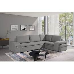 Rozkládací rohová pohovka AIL je obývací nábytek s funkcí spaní, který je k dispozici v pravé nebo levé variantě. Stylová rohová pohovka se dvěma přihrádkami na lůžkoviny je vybavena speciální automatickou funkcí pro snadné rozložení, takže budete mít rychlý přístup k přikrývkám a polštářům a zároveň si vytvoříte prostor na spaní. Rohová sedací souprava s bočnicemi je nábytek pro více osob, jehož moderní estetiku podtrhují chromované nohy. Čalouněná rohová sedací souprava do obývacího pokoje je kus nábytku s vestavěným úložným prostorem a vestavěným prostorem pro taburet, který je k dispozici v sadě. Taburet AIL bude nejen dekorativním prvkem interiéru, ale poskytne také další místo k sezení a bude užitečný i jako praktická opěrka nohou. Rohová sedací souprava s dřevěným rámem se vyznačuje zvýšenou odolností a stabilitou, díky čemuž na ní může odpočívat mnoho lidí. Dekorativně prošívaný sedák a mírně profilovaný opěrák jsou vyplněny čalounickou pěnou T-30 a vlnitými pružinami, díky nimž uživatel získá maximální pohodlí při sezení. Model AIL je nábytek vyrobený na zakázku, takže si můžete vybrat barvu čalounění podle svých individuálních preferencí.