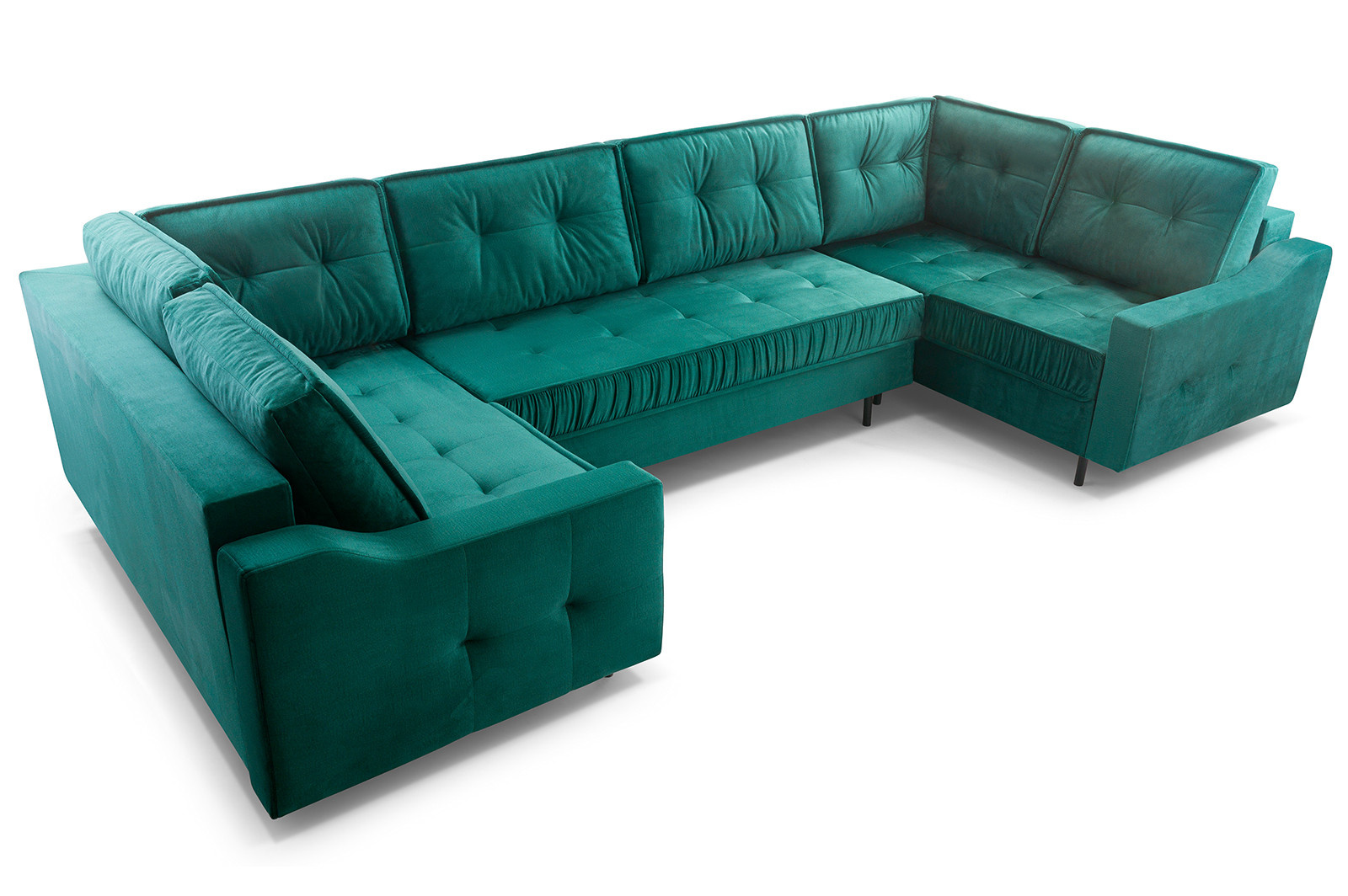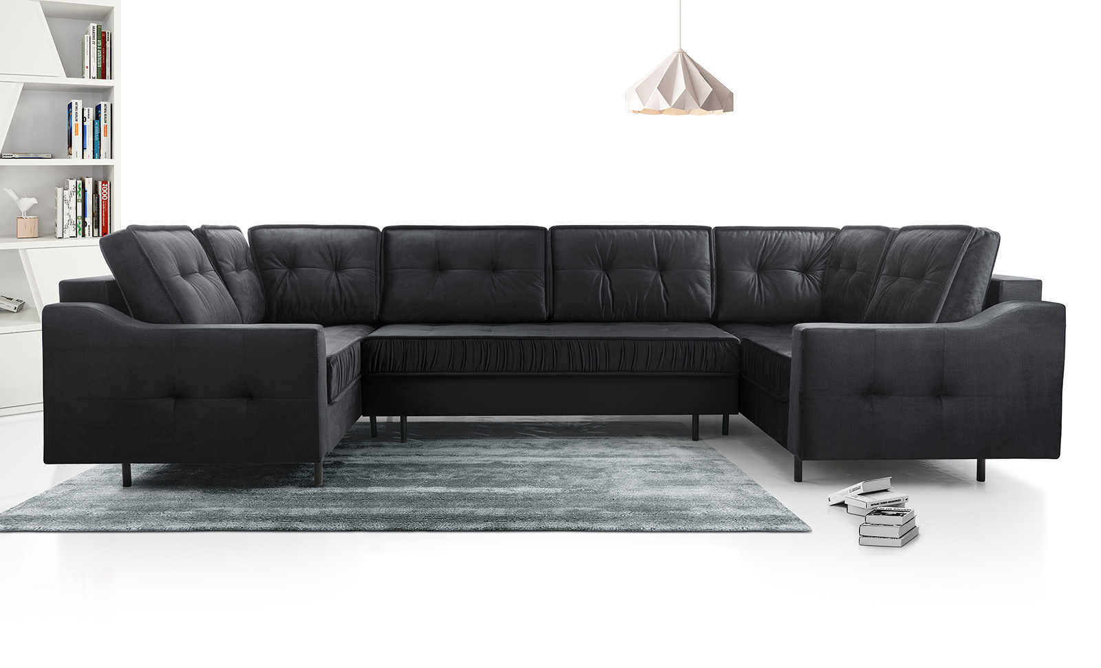 Rohová sedací souprava AKITA U je elegantní sedací souprava ve tvaru písmene U, která má poměrně univerzální tvar, takže ji lze bez větších problémů umístit ke stěně i doprostřed místnosti - jedná se o volně stojící kus nábytku s čalouněným opěradlem. Rozkládací rohová sedačka s rozkládáním, je vybavena třemi úložnými prostory a má funkci spaní. Stabilní a odolnou konstrukci tvoří dřevěný rám a prostor pod čalouněním je zakončen vlnitou pružinou a čalounickou pěnou, díky níž na nábytku nezůstanou nevzhledné otlaky ani deformace. Akcentem, který nábytku dodává originalitu a lehkost, jsou ozdobné černé nohy. Rohová pohovka pro více osob je kus nábytku plně čalouněný kvalitní látkou, jejíž barevné provedení si můžete vybrat. Rohová sedací souprava AKITA U s bočnicemi v základním provedení . Sedací soupravu lze umístit doprostřed místnosti.